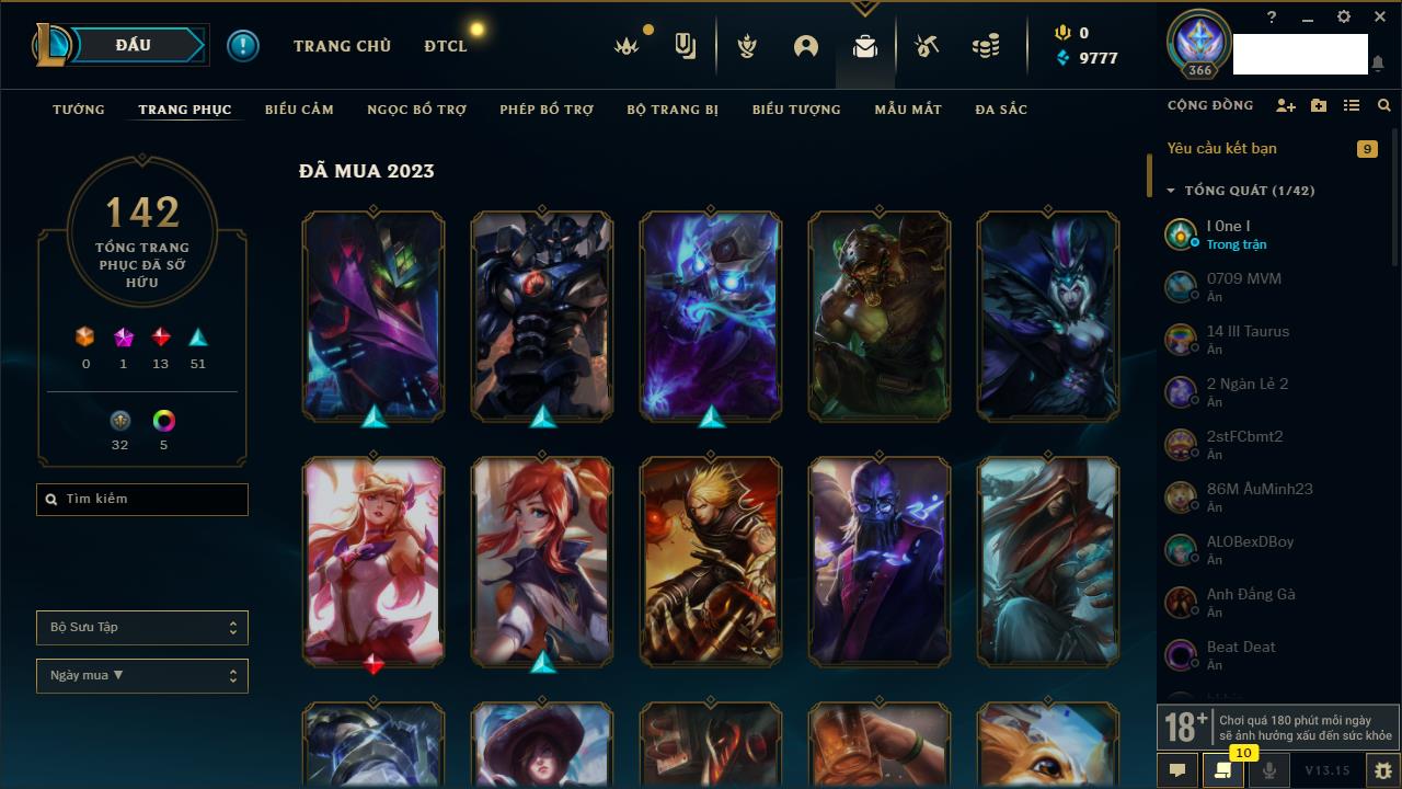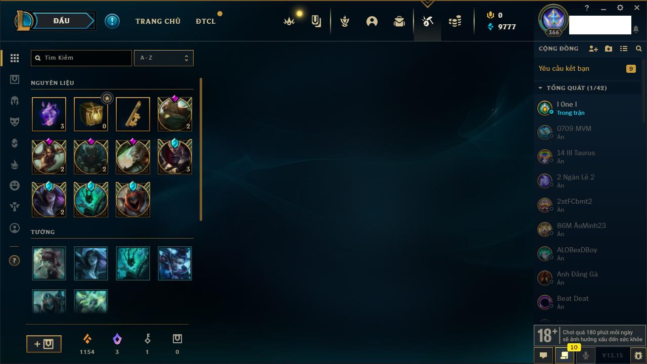 Rank Đơn: Vàng IKhung: VàngTướng: 155 - Còn 18217 THXTrang Phục: 63Rank ĐTCL: Chưa RankLinh Thú: 49