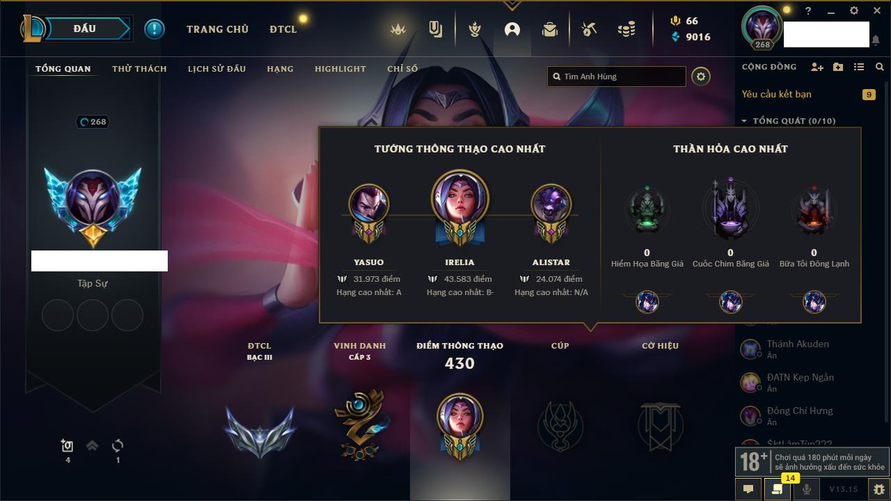Rank Đơn: Bạc IIKhung: VàngTướng: 171 - Còn 332462 THXTrang Phục: 165Rank ĐTCL: Kim Cương IVLinh Thú: 181