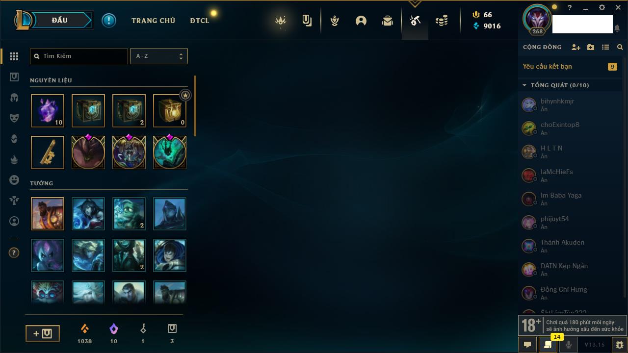 Rank Đơn: Vàng IVKhung: BạcTướng: 166 - Còn 180925 THXTrang Phục: 163Rank ĐTCL: Chưa RankLinh Thú: 67