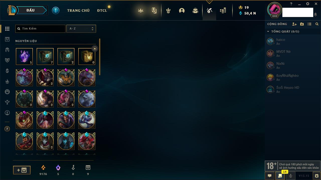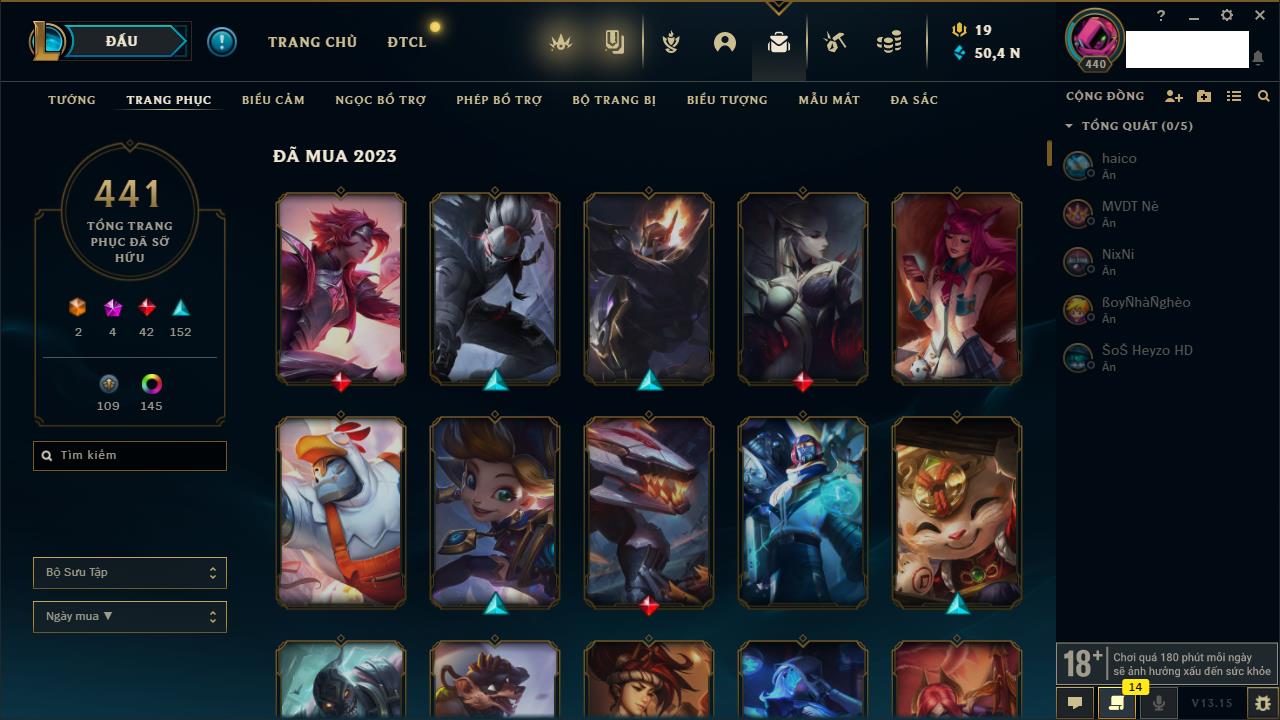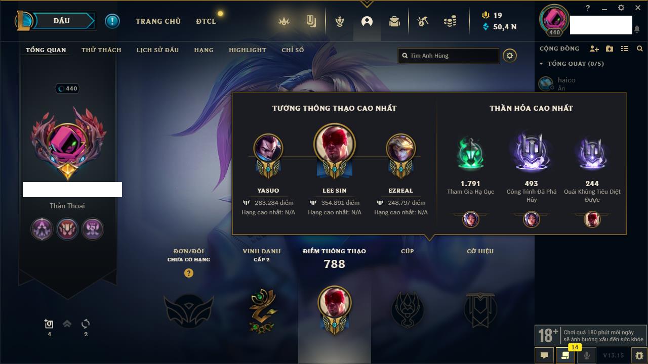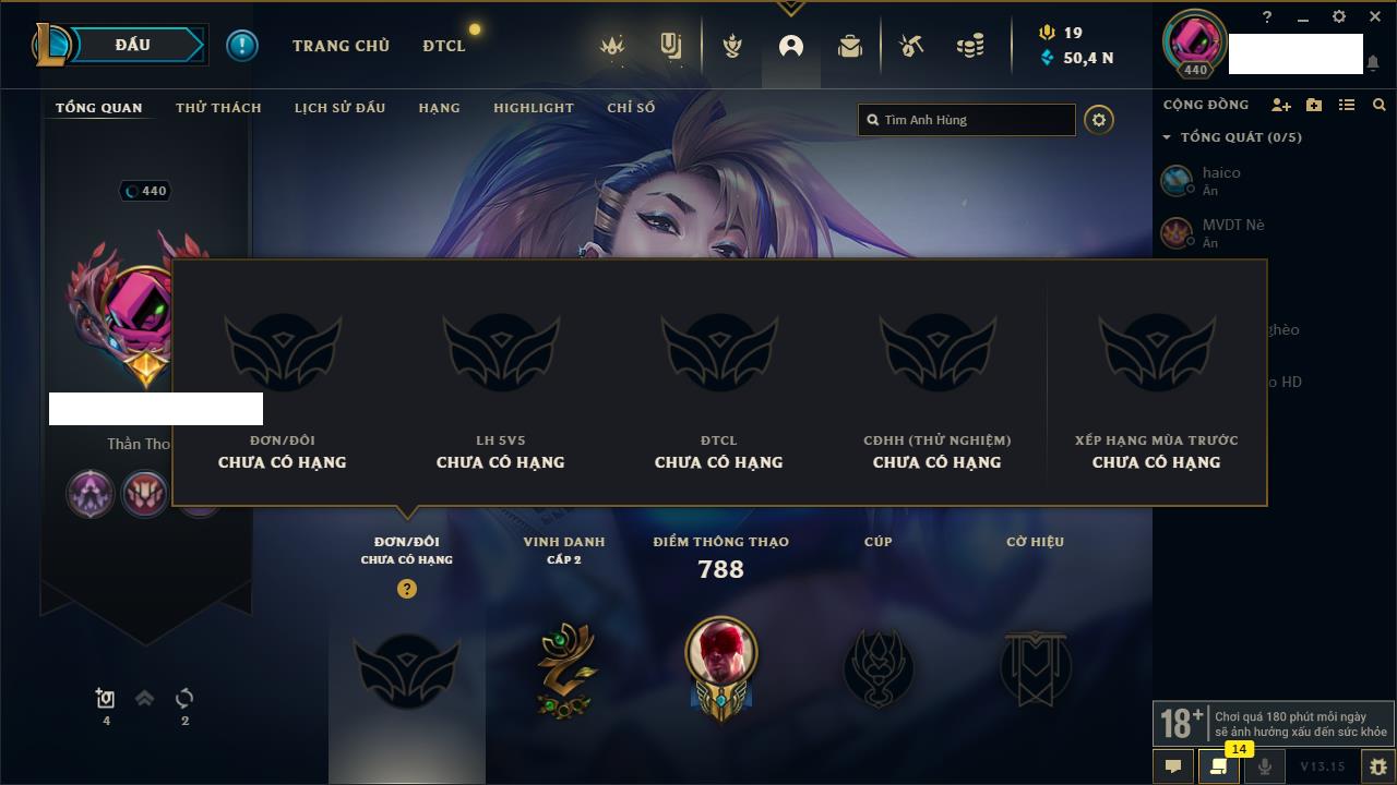 Rank Đơn: Bạc IIKhung: Bạch kimTướng: 169 - Còn 81813 THXTrang Phục: 301Rank ĐTCL: Chưa RankLinh Thú: 140