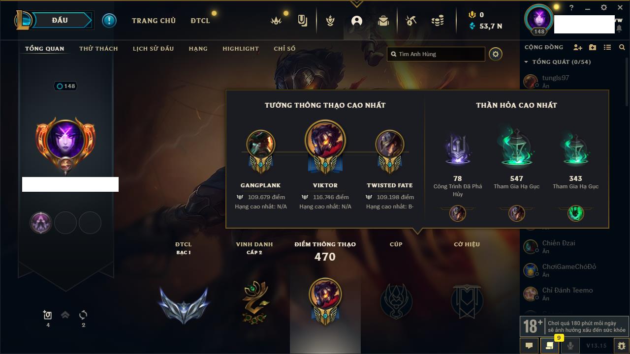 Rank Đơn: Chưa RankKhung: Chưa có khungTướng: 167 - Còn 20912 THXTrang Phục: 154Rank ĐTCL: Chưa RankLinh Thú: 107