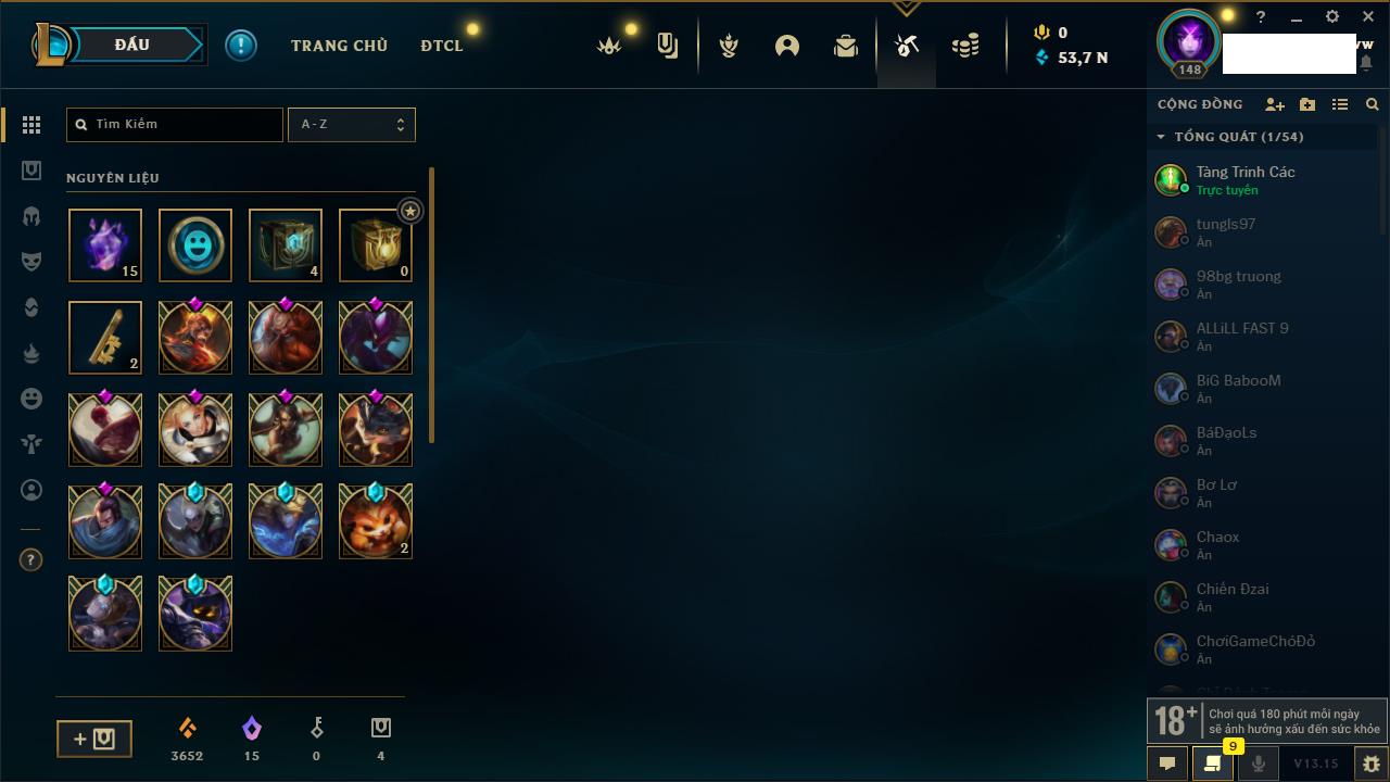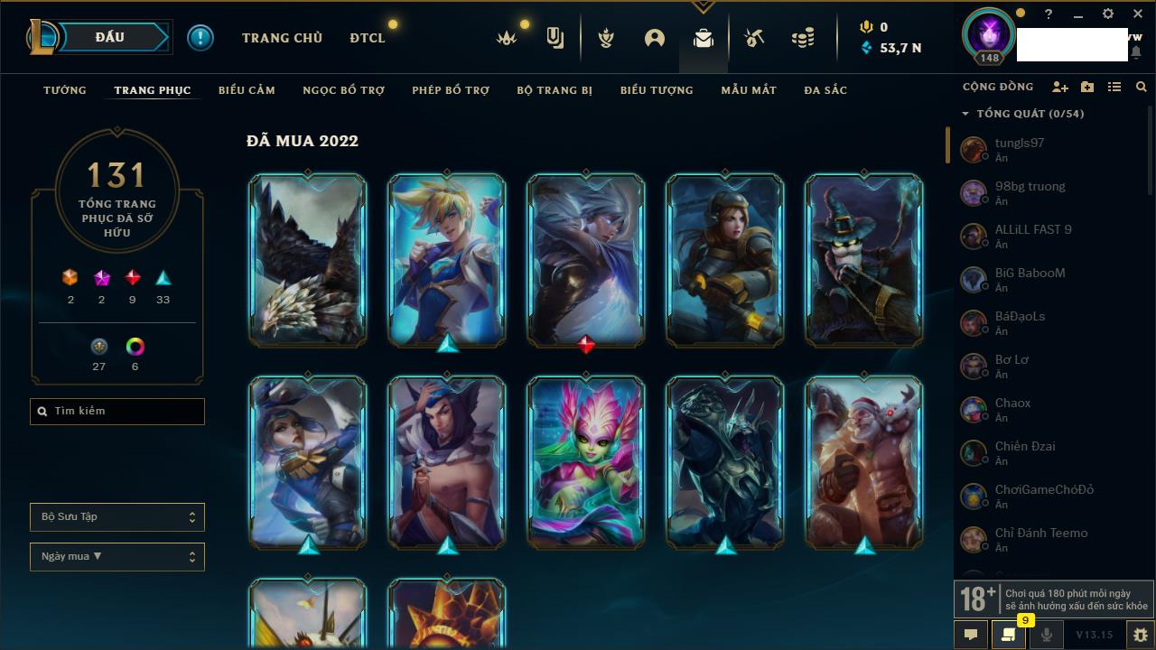 Rank Đơn: Chưa RankKhung: Chưa có khungTướng: 148 - Còn 2211 THXTrang Phục: 97Rank ĐTCL: Chưa RankLinh Thú: 77