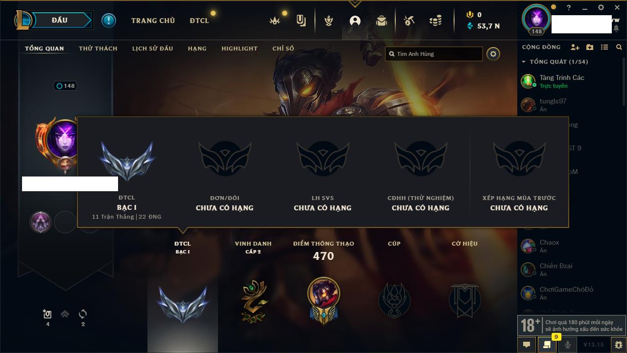 Rank Đơn: Sắt IKhung: SắtTướng: 38 - Còn 731 THXTrang Phục: 8Rank ĐTCL: Chưa RankLinh Thú: 72
