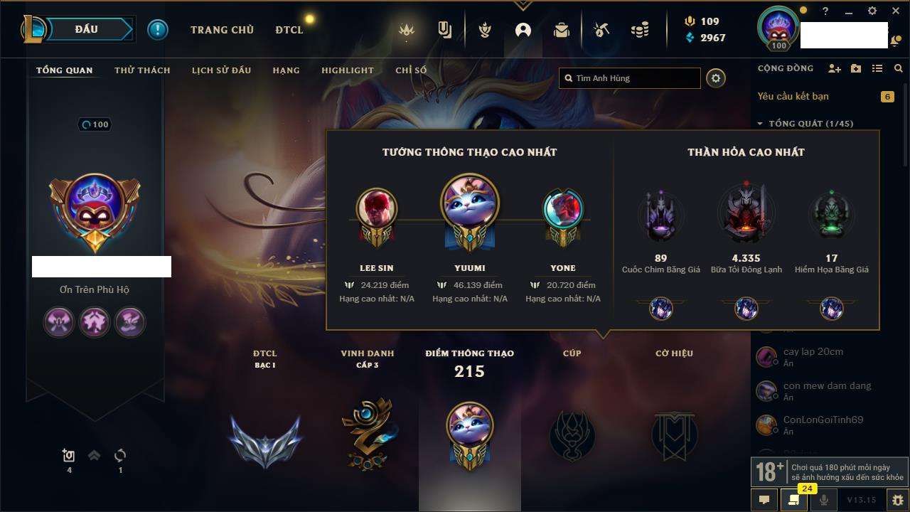Rank Đơn: Vàng IIIKhung: BạcTướng: 56 - Còn 910 THXTrang Phục: 9Rank ĐTCL: Chưa RankLinh Thú: 31