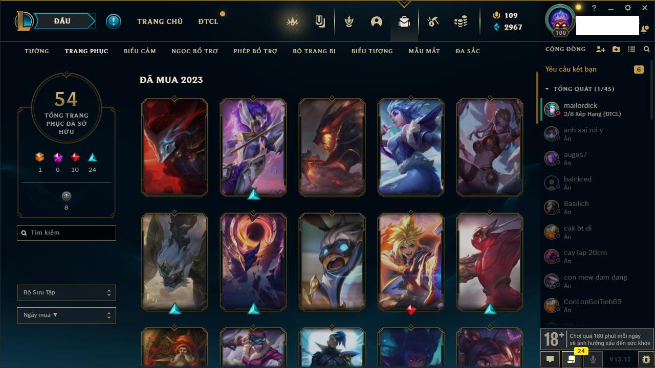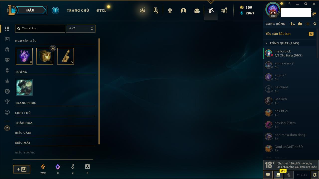Rank Đơn: Chưa rank mùa nàoKhung: Chưa có khungTướng: 108 - Còn 6515 THXTrang Phục: 23Rank ĐTCL: Chưa RankLinh Thú: 111