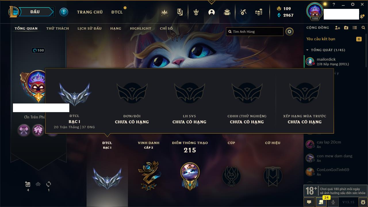 Rank Đơn: Vàng IIIKhung: VàngTướng: 77 - Còn 21172 THXTrang Phục: 8Rank ĐTCL: Kim Cương IIILinh Thú: 23