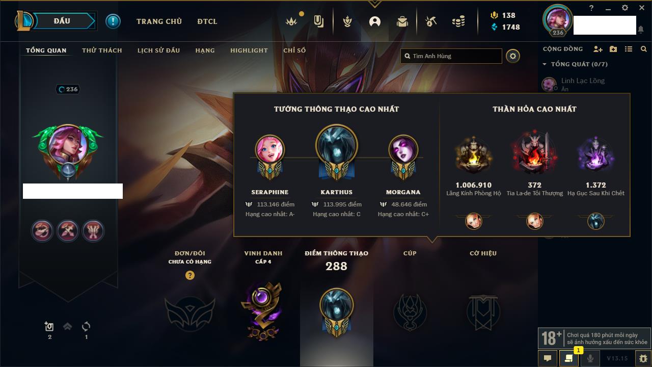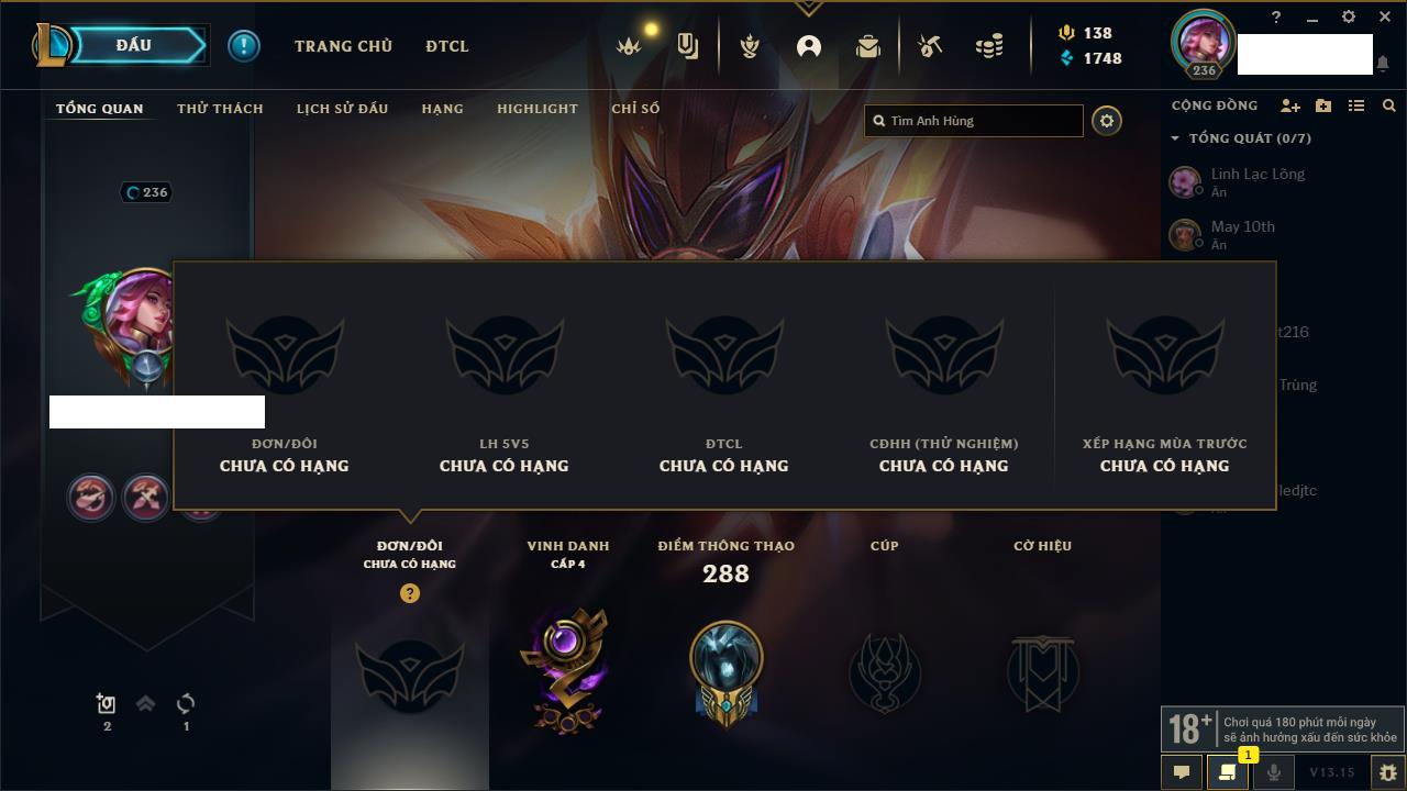 Rank Đơn: Bạch Kim IVKhung: Bạch kimTướng: 172 - Còn 326966 THXTrang Phục: 234Rank ĐTCL: Kim Cương IVLinh Thú: 167