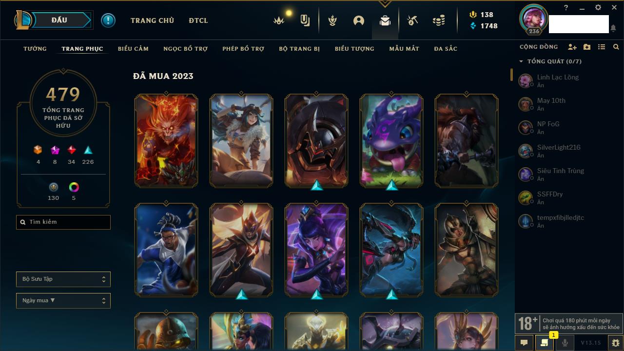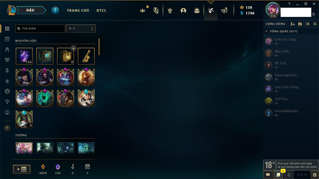 Rank Đơn: Bạc IIKhung: Chưa có khungTướng: 145 - Còn 12230 THXTrang Phục: 183Rank ĐTCL: Chưa RankLinh Thú: 71