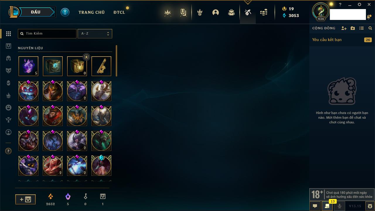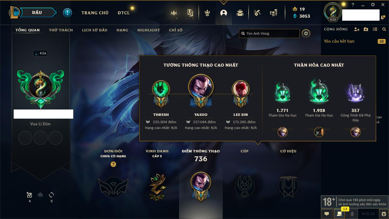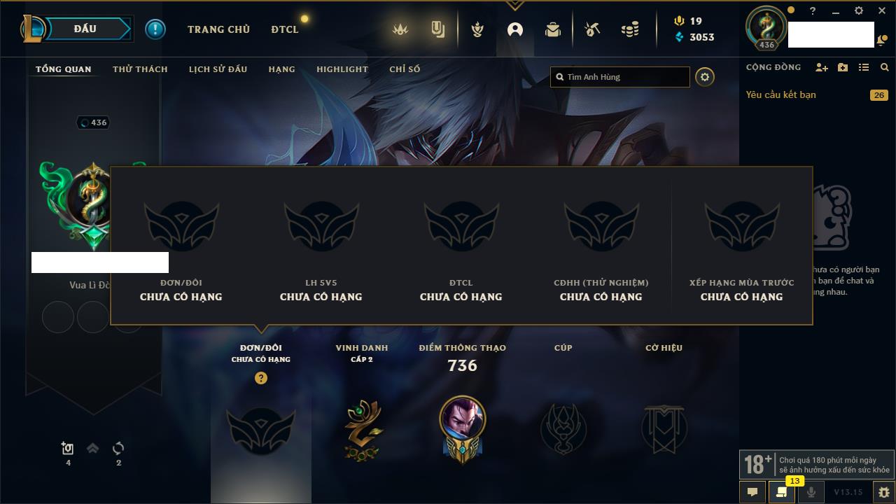 Rank Đơn: Chưa RankKhung: Chưa có khungTướng: 167 - Còn 100681 THXTrang Phục: 404Rank ĐTCL: Chưa RankLinh Thú: 207
