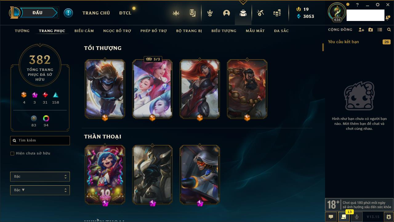 Rank Đơn: Chưa RankKhung: Chưa có khungTướng: 169 - Còn 31965 THXTrang Phục: 383Rank ĐTCL: Chưa RankLinh Thú: 171