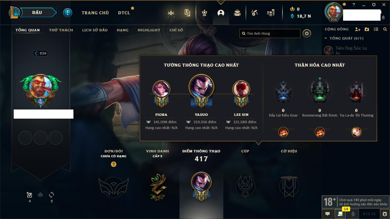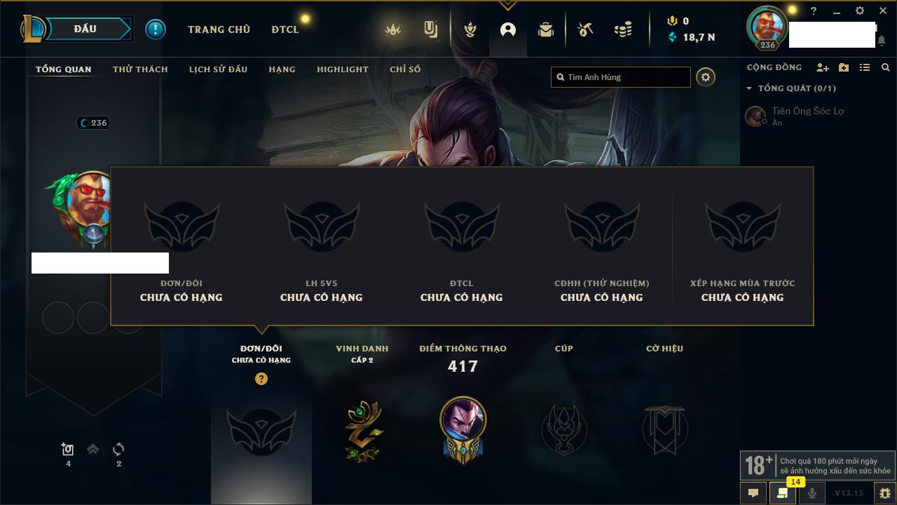 Rank Đơn: Chưa RankKhung: Chưa có khungTướng: 118 - Còn 13712 THXTrang Phục: 117Rank ĐTCL: Chưa RankLinh Thú: 34