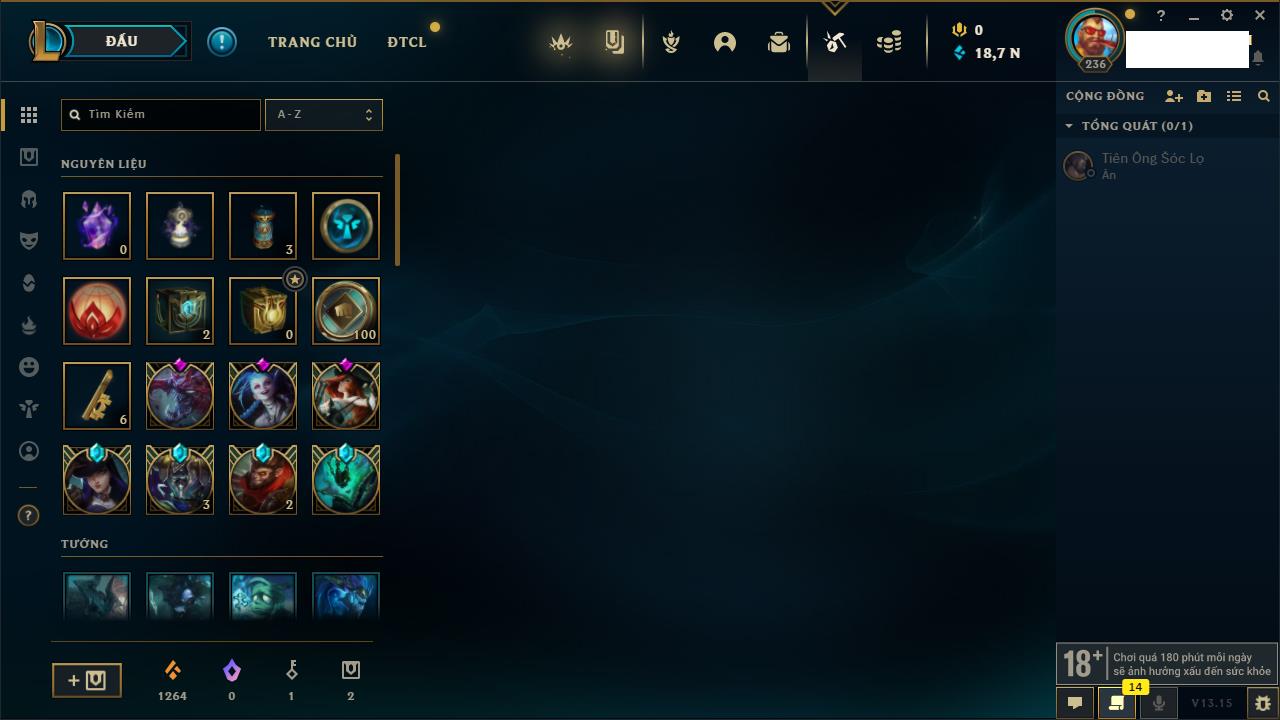 Rank Đơn: Chưa RankKhung: Chưa có khungTướng: 165 - Còn 3214 THXTrang Phục: 160Rank ĐTCL: Chưa RankLinh Thú: 28