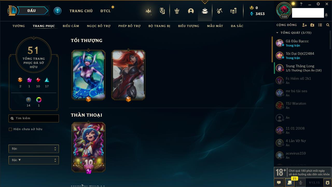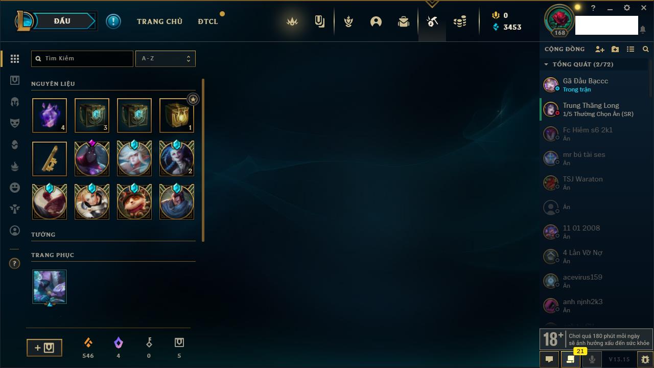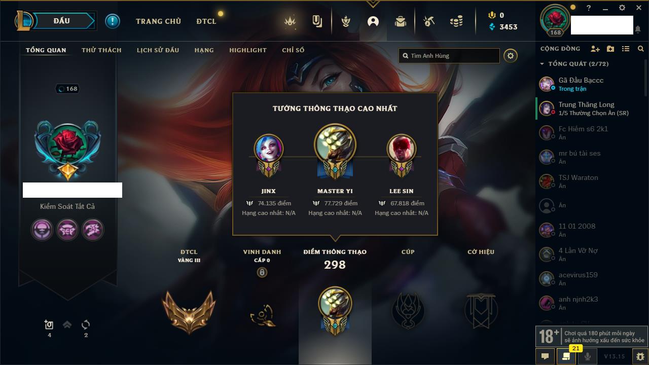 Rank Đơn: Sắt IIIKhung: Chưa có khungTướng: 77 - Còn 8133 THXTrang Phục: 11Rank ĐTCL: Bạch Kim IVLinh Thú: 108