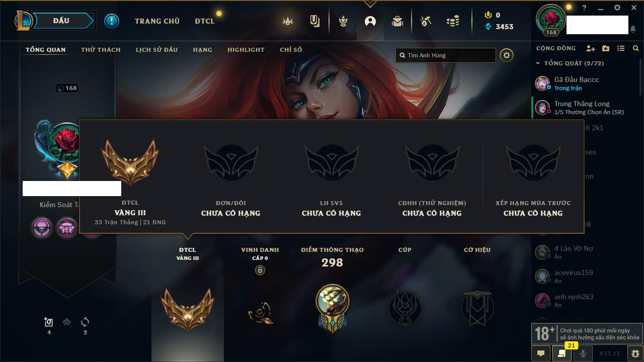 Rank Đơn: Vàng IIIKhung: VàngTướng: 77 - Còn 21172 THXTrang Phục: 8Rank ĐTCL: Kim Cương IIILinh Thú: 23