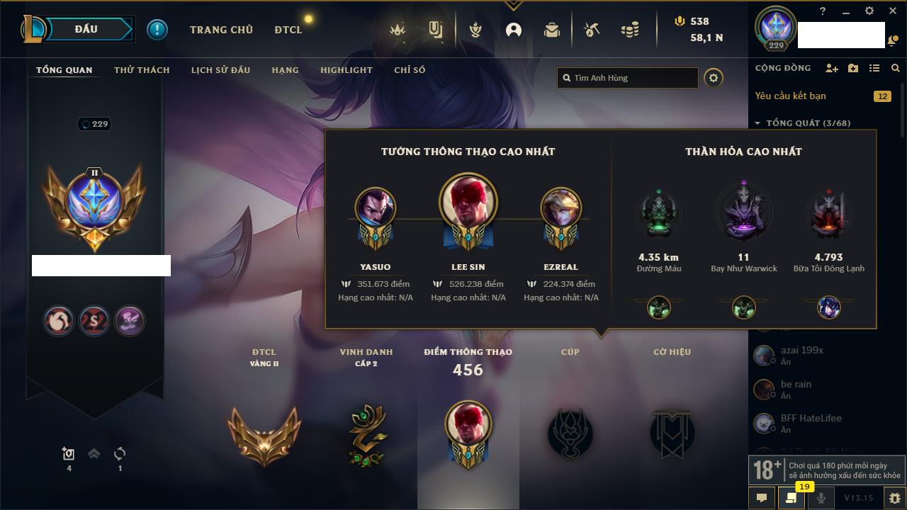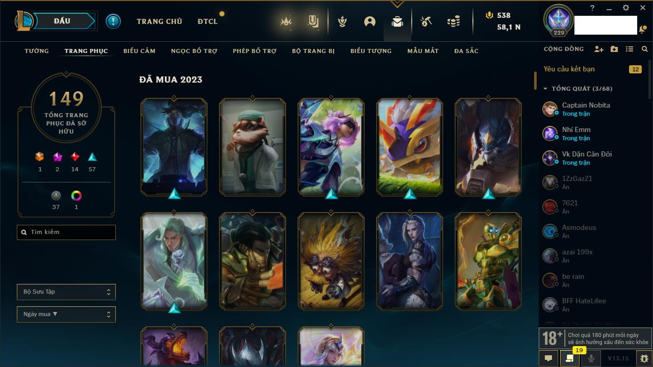 Rank Đơn: Chưa RankKhung: Chưa có khungTướng: 154 - Còn 18477 THXTrang Phục: 127Rank ĐTCL: Vàng ILinh Thú: 183