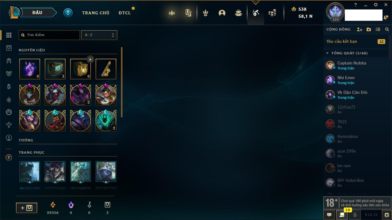 Rank Đơn: Chưa RankKhung: Chưa có khungTướng: 162 - Còn 23234 THXTrang Phục: 150Rank ĐTCL: Chưa RankLinh Thú: 42