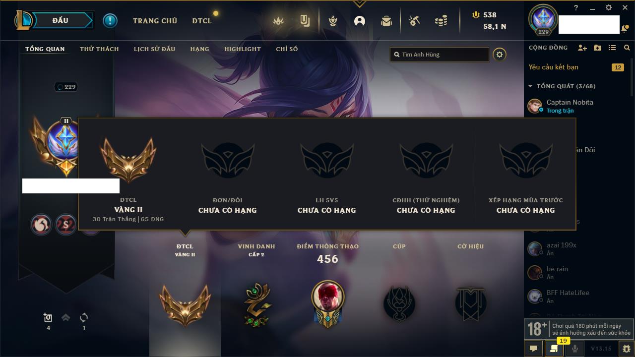 Rank Đơn: Chưa RankKhung: Chưa có khungTướng: 69 - Còn 3036 THXTrang Phục: 67Rank ĐTCL: Chưa RankLinh Thú: 6