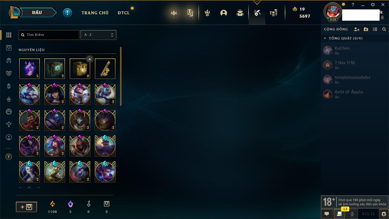 Rank Đơn: Vàng IVKhung: VàngTướng: 171 - Còn 48721 THXTrang Phục: 171Rank ĐTCL: Chưa RankLinh Thú: 27