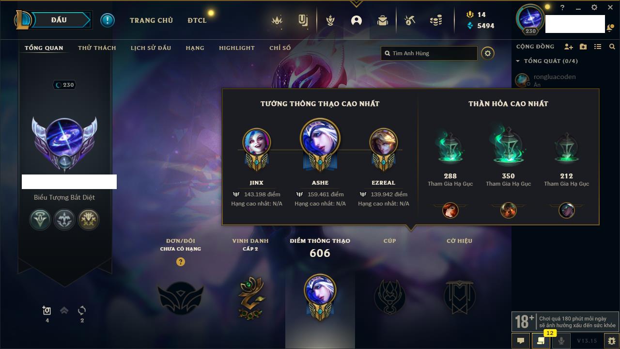 Rank Đơn: Bạch Kim IVKhung: Bạch kimTướng: 171 - Còn 54021 THXTrang Phục: 327Rank ĐTCL: Chưa RankLinh Thú: 115