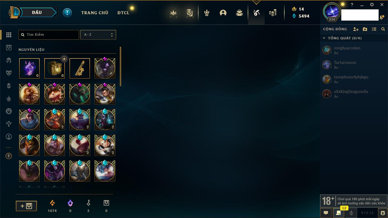 Rank Đơn: Vàng IIIKhung: VàngTướng: 171 - Còn 224994 THXTrang Phục: 273Rank ĐTCL: Vàng IVLinh Thú: 192
