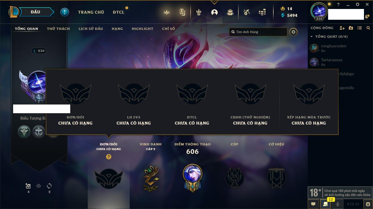 Rank Đơn: Bạch Kim IIKhung: Bạch kimTướng: 171 - Còn 141298 THXTrang Phục: 274Rank ĐTCL: Bạch Kim IILinh Thú: 188
