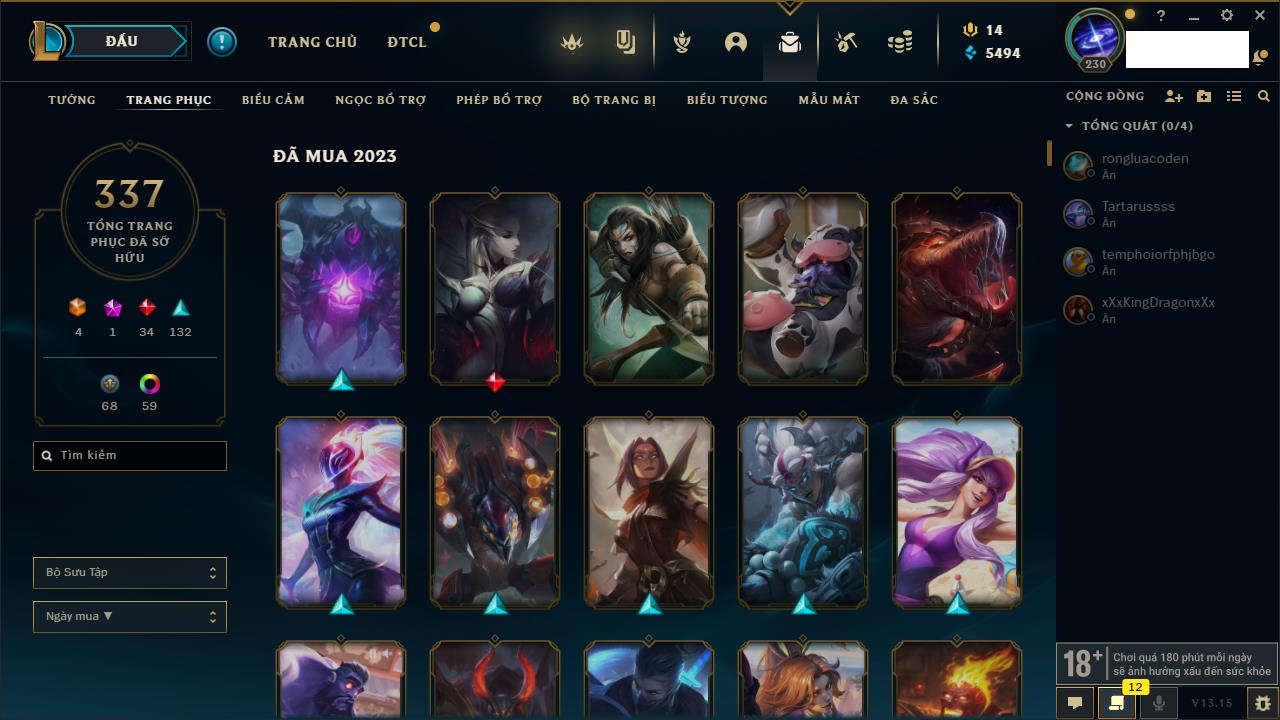 Rank Đơn: Vàng IIIKhung: VàngTướng: 171 - Còn 88128 THXTrang Phục: 329Rank ĐTCL: Chưa RankLinh Thú: 41