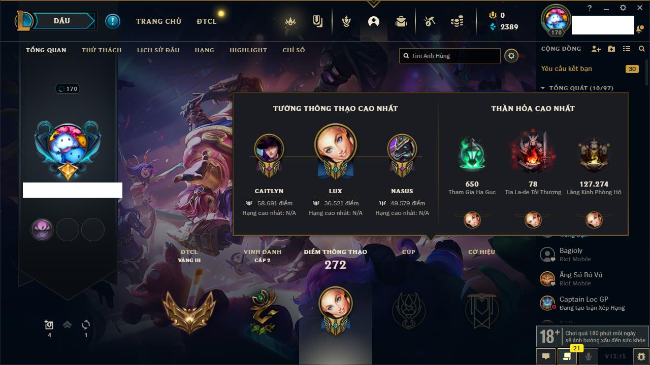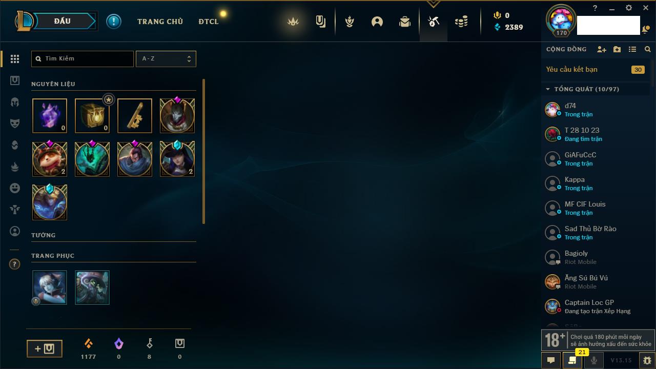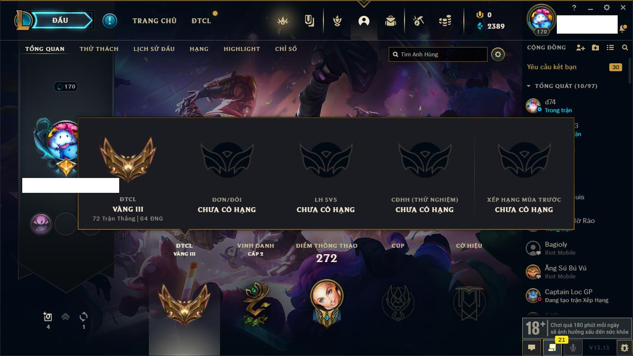 Rank Đơn: Chưa rank mùa nàoKhung: Chưa có khungTướng: 3 - Còn 34550 THXTrang Phục: 0Rank ĐTCL: Bạch Kim IVLinh Thú: 41