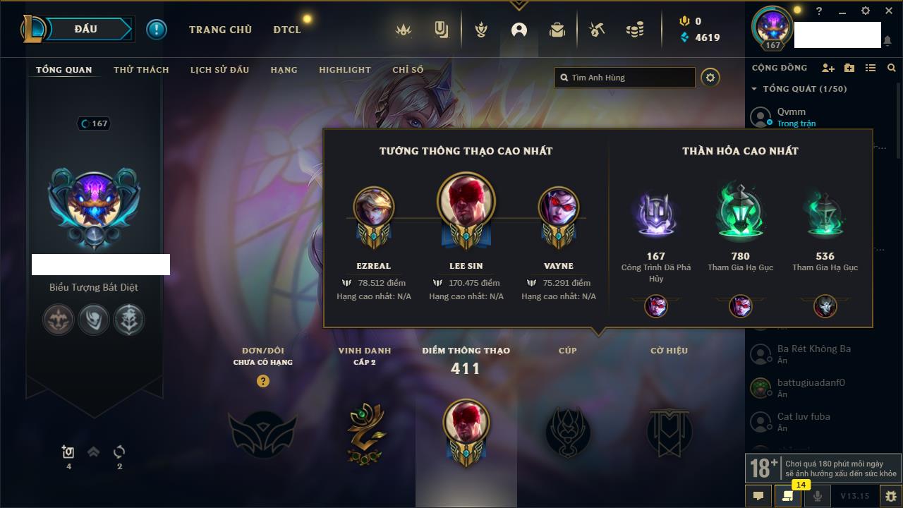 Rank Đơn: Chưa rank mùa nàoKhung: Chưa có khungTướng: 4 - Còn 17650 THXTrang Phục: 0Rank ĐTCL: Chưa RankLinh Thú: 24