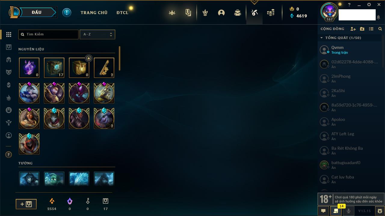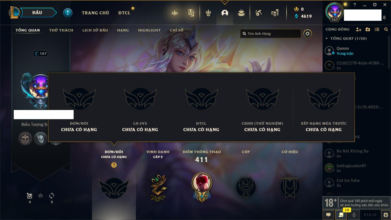 Rank Đơn: Chưa rank mùa nàoKhung: Chưa có khungTướng: 3 - Còn 34550 THXTrang Phục: 0Rank ĐTCL: Bạch Kim IVLinh Thú: 41