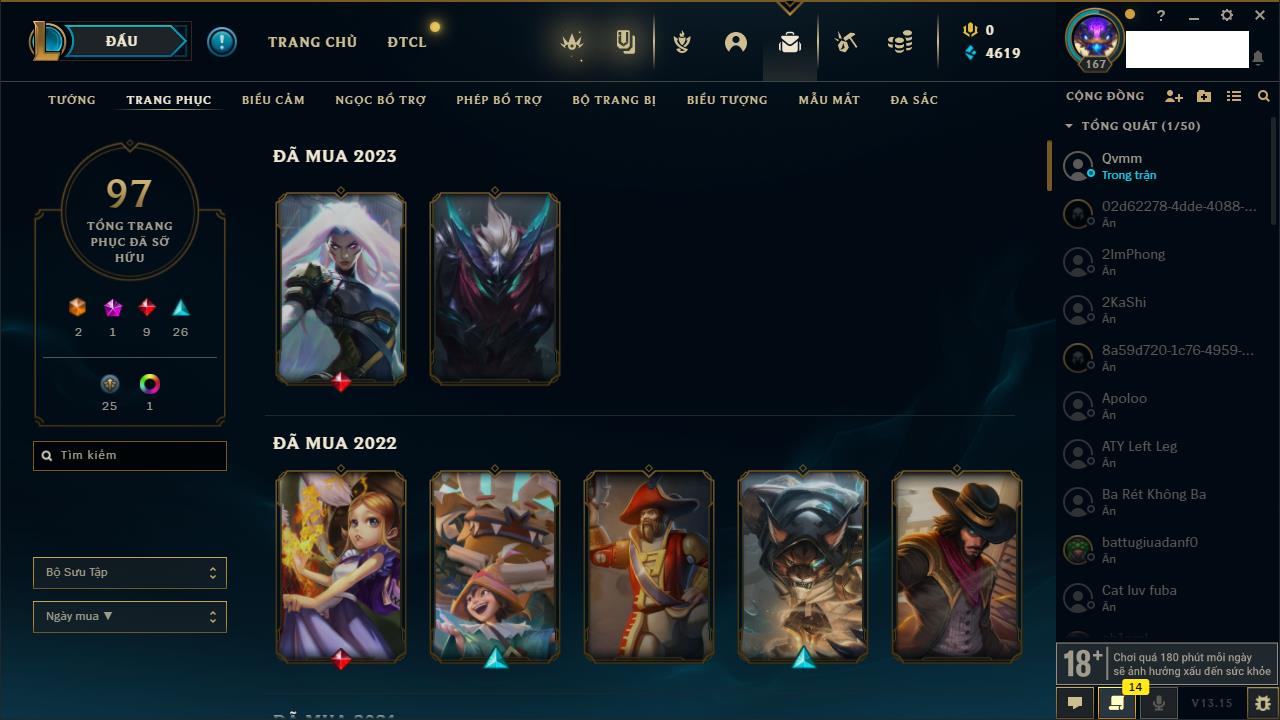 Rank Đơn: Chưa RankKhung: Chưa có khungTướng: 55 - Còn 20253 THXTrang Phục: 14Rank ĐTCL: Bạc IILinh Thú: 88
