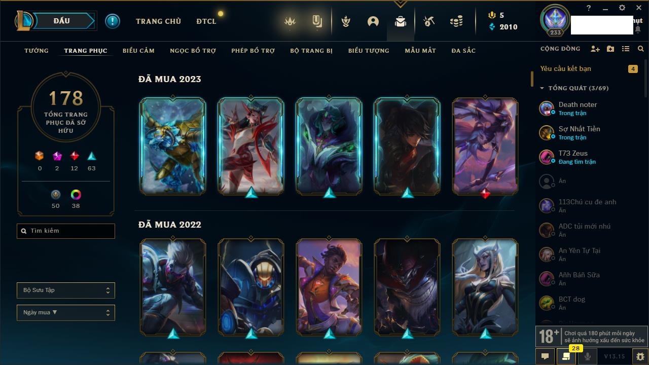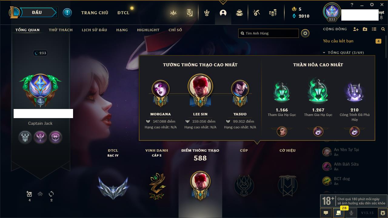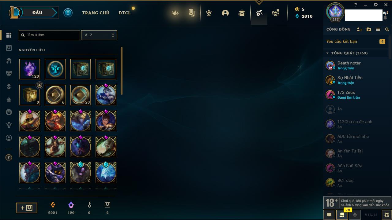 Rank Đơn: Chưa RankKhung: Chưa có khungTướng: 157 - Còn 6783 THXTrang Phục: 50Rank ĐTCL: Chưa RankLinh Thú: 37
