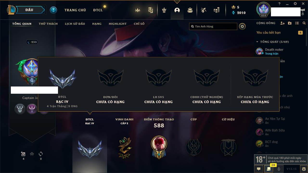 Rank Đơn: Vàng IVKhung: VàngTướng: 146 - Còn 89110 THXTrang Phục: 63Rank ĐTCL: Vàng IIILinh Thú: 41