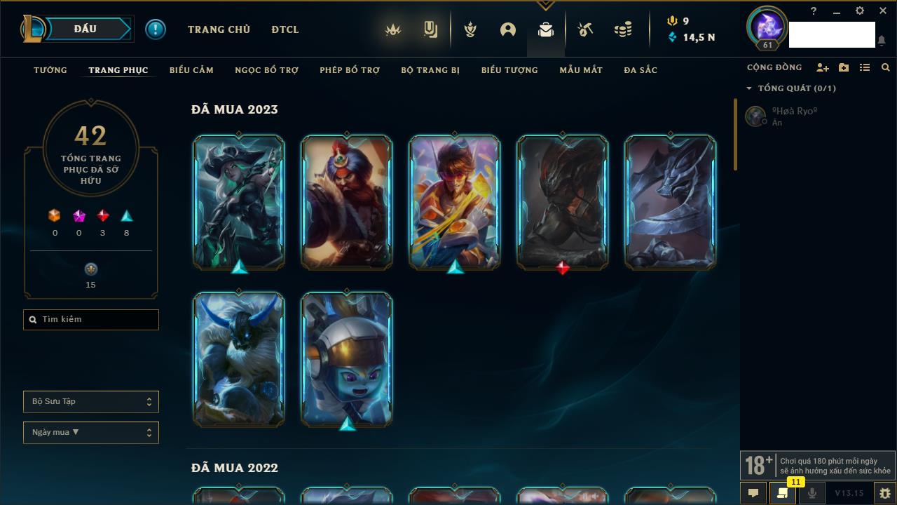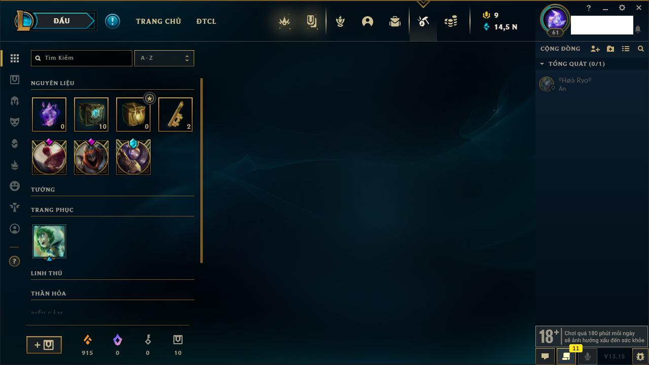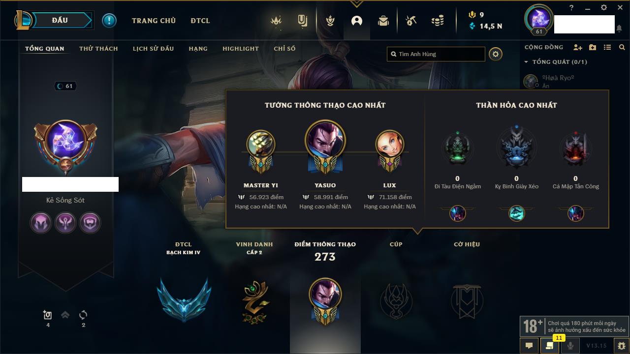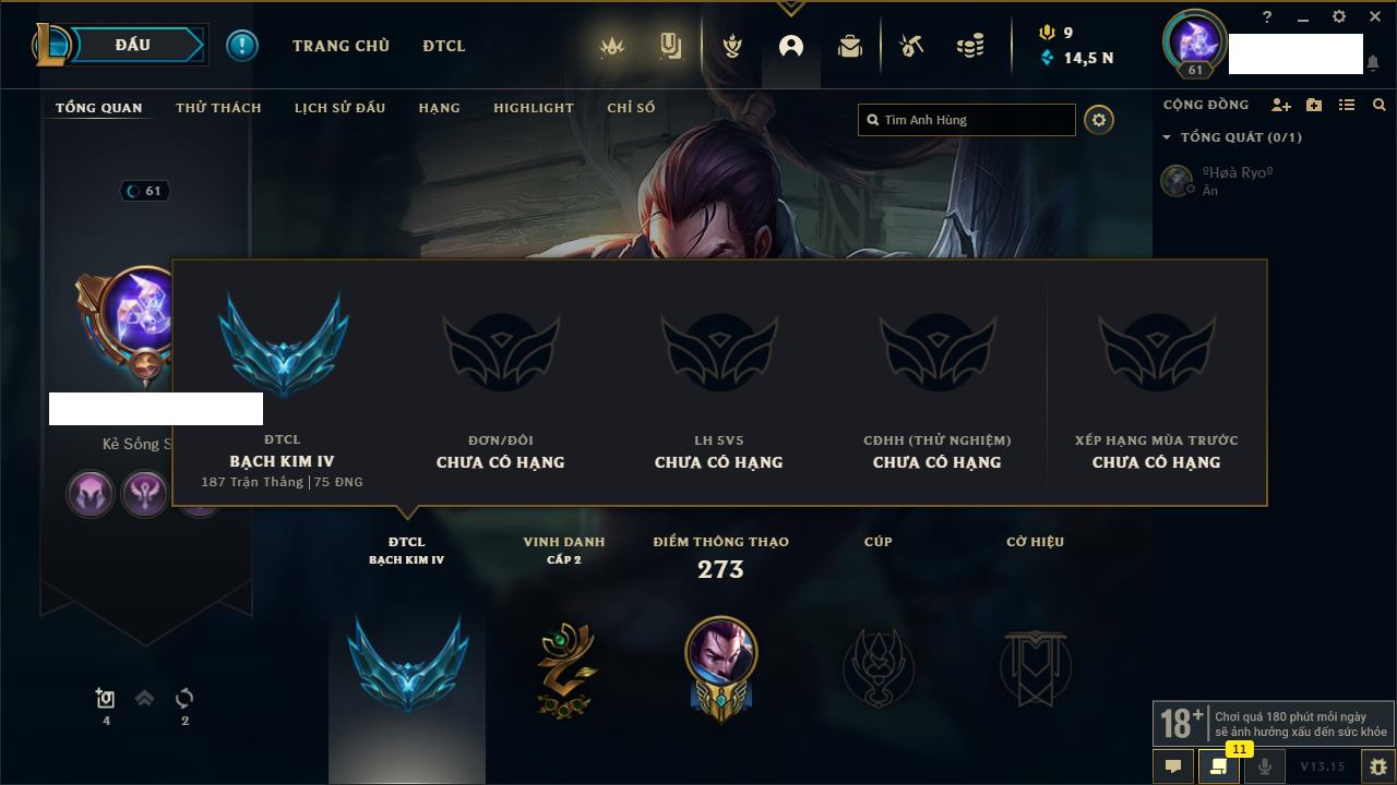 Rank Đơn: Chưa rank mùa nàoKhung: Chưa có khungTướng: 8 - Còn 14835 THXTrang Phục: 1Rank ĐTCL: Chưa RankLinh Thú: 7
