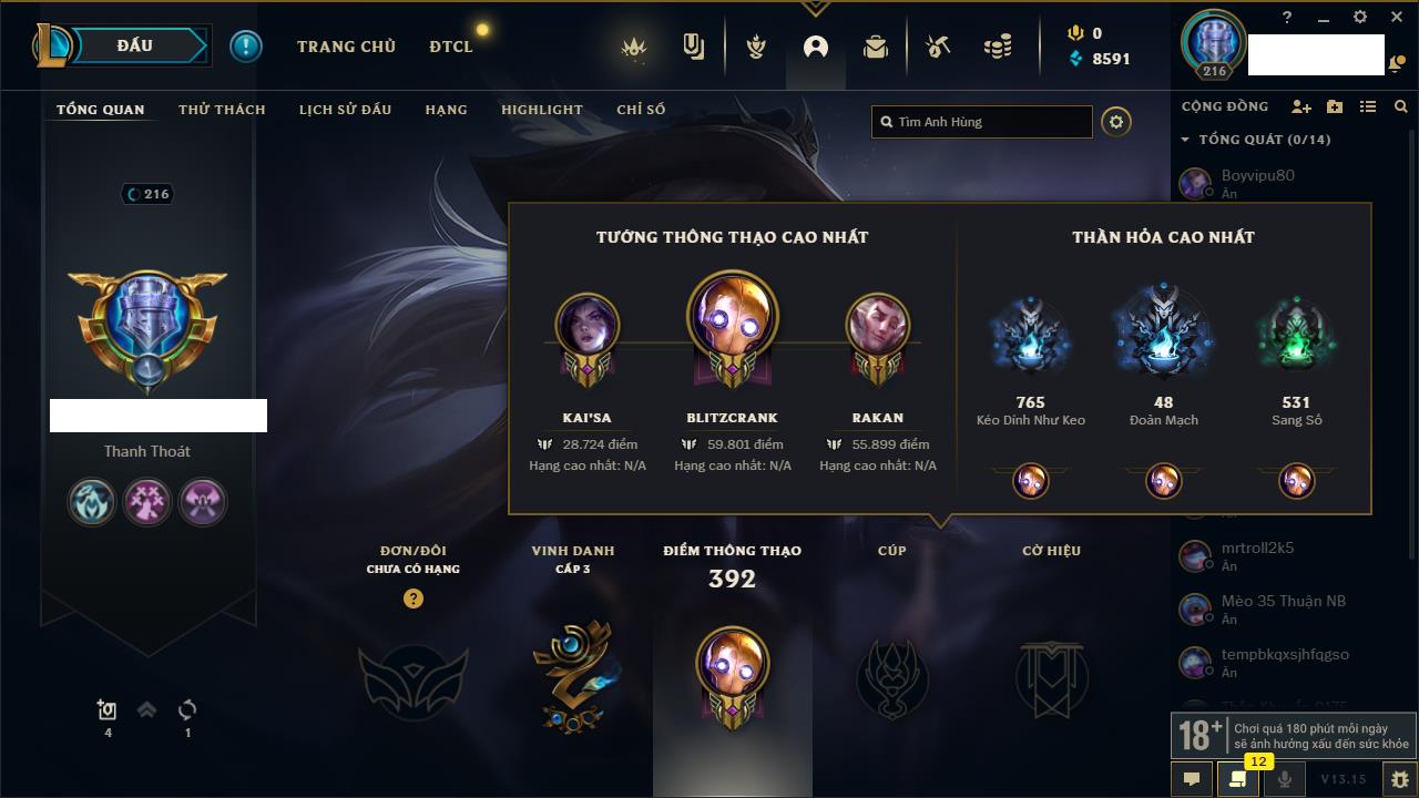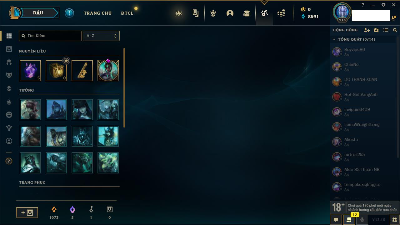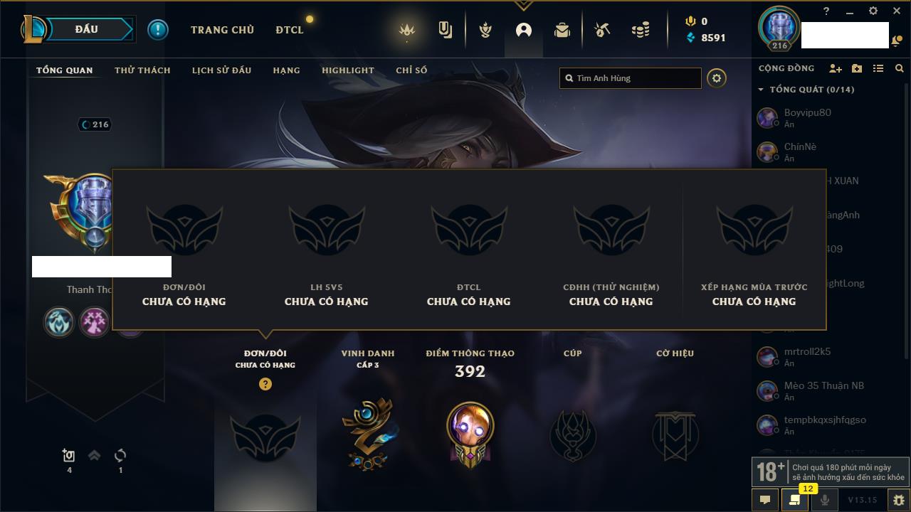 Rank Đơn: Bạc IIIKhung: Chưa có khungTướng: 171 - Còn 21493 THXTrang Phục: 252Rank ĐTCL: Bạch Kim IVLinh Thú: 123