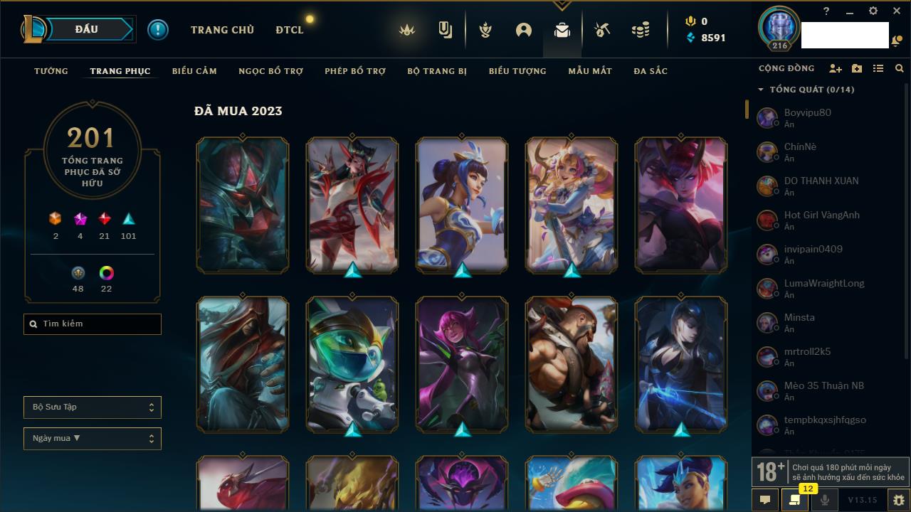 Rank Đơn: Vàng IIKhung: VàngTướng: 171 - Còn 34018 THXTrang Phục: 250Rank ĐTCL: Sắt IILinh Thú: 19