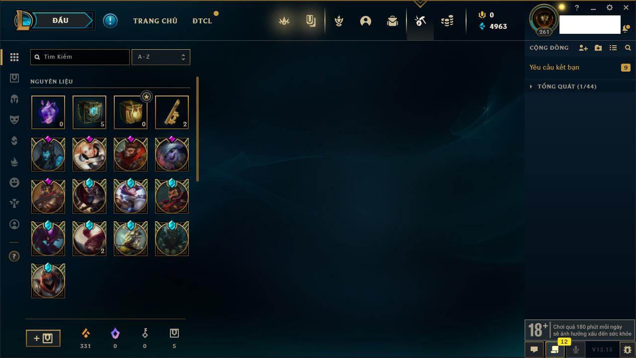 Rank Đơn: Vàng IVKhung: BạcTướng: 171 - Còn 231097 THXTrang Phục: 180Rank ĐTCL: Vàng IVLinh Thú: 110