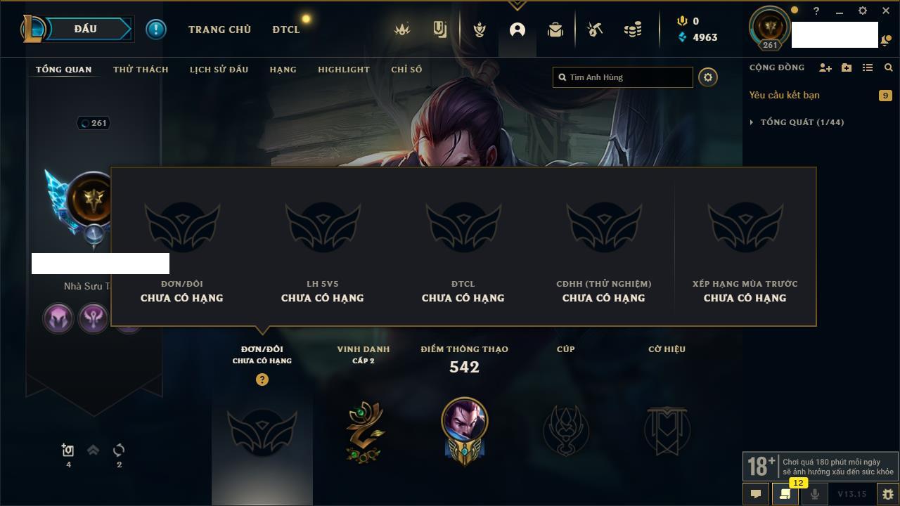 Rank Đơn: Vàng IVKhung: BạcTướng: 166 - Còn 180925 THXTrang Phục: 163Rank ĐTCL: Chưa RankLinh Thú: 67