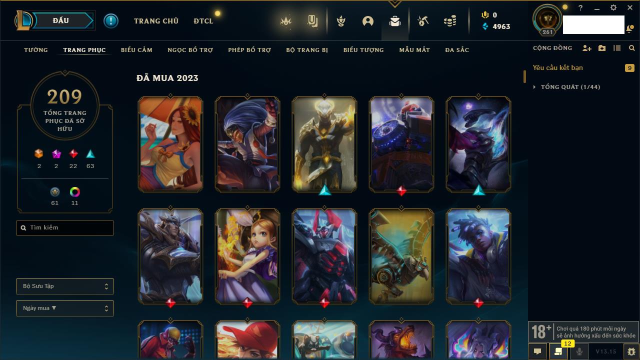 Rank Đơn: Vàng IVKhung: VàngTướng: 171 - Còn 48721 THXTrang Phục: 171Rank ĐTCL: Chưa RankLinh Thú: 27