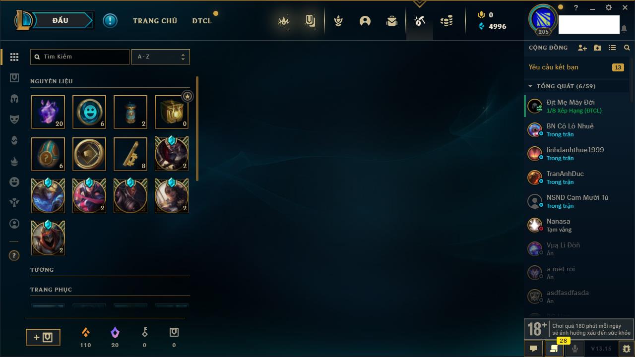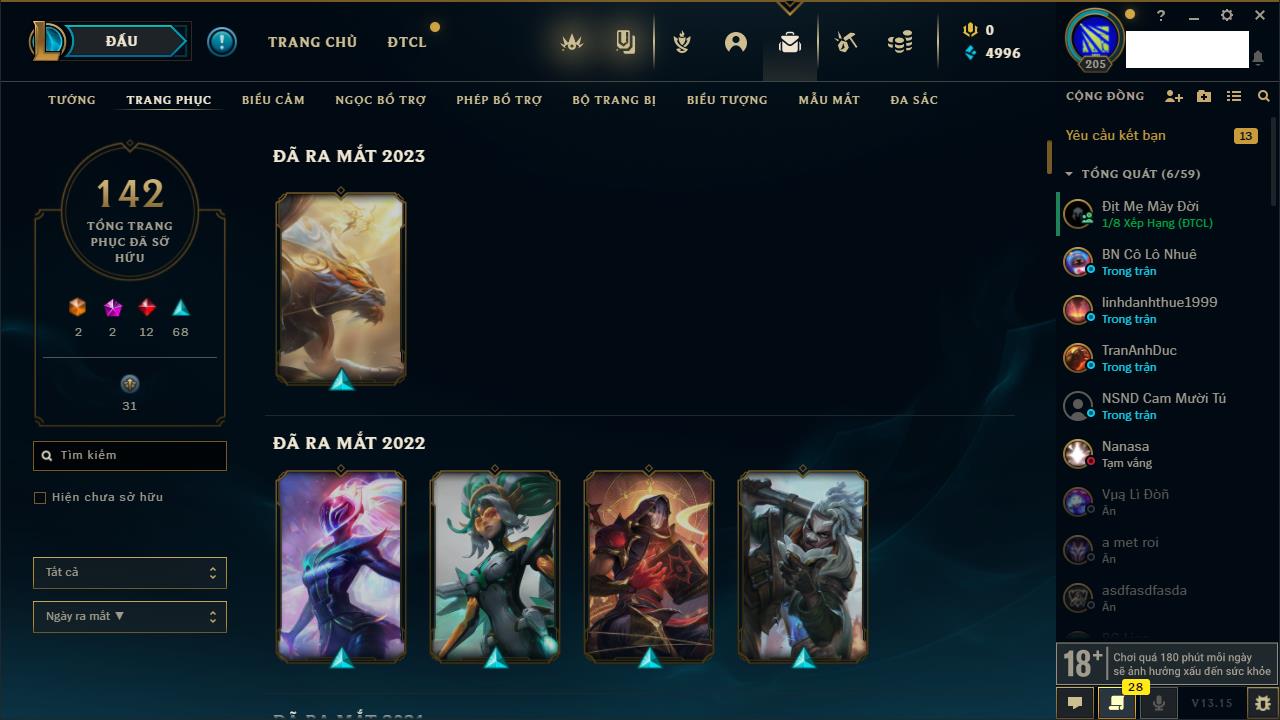 Rank Đơn: Chưa RankKhung: Chưa có khungTướng: 162 - Còn 23234 THXTrang Phục: 150Rank ĐTCL: Chưa RankLinh Thú: 42