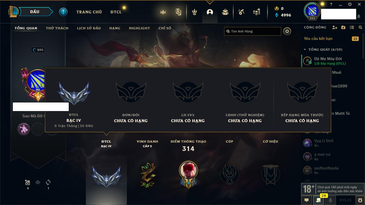 Rank Đơn: Chưa RankKhung: BạcTướng: 141 - Còn 299 THXTrang Phục: 101Rank ĐTCL: Chưa RankLinh Thú: 84