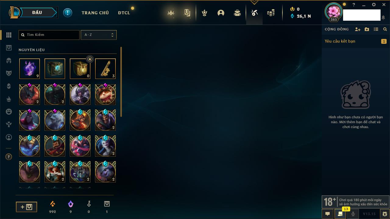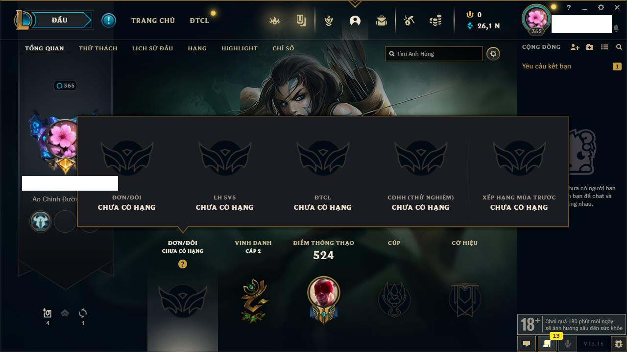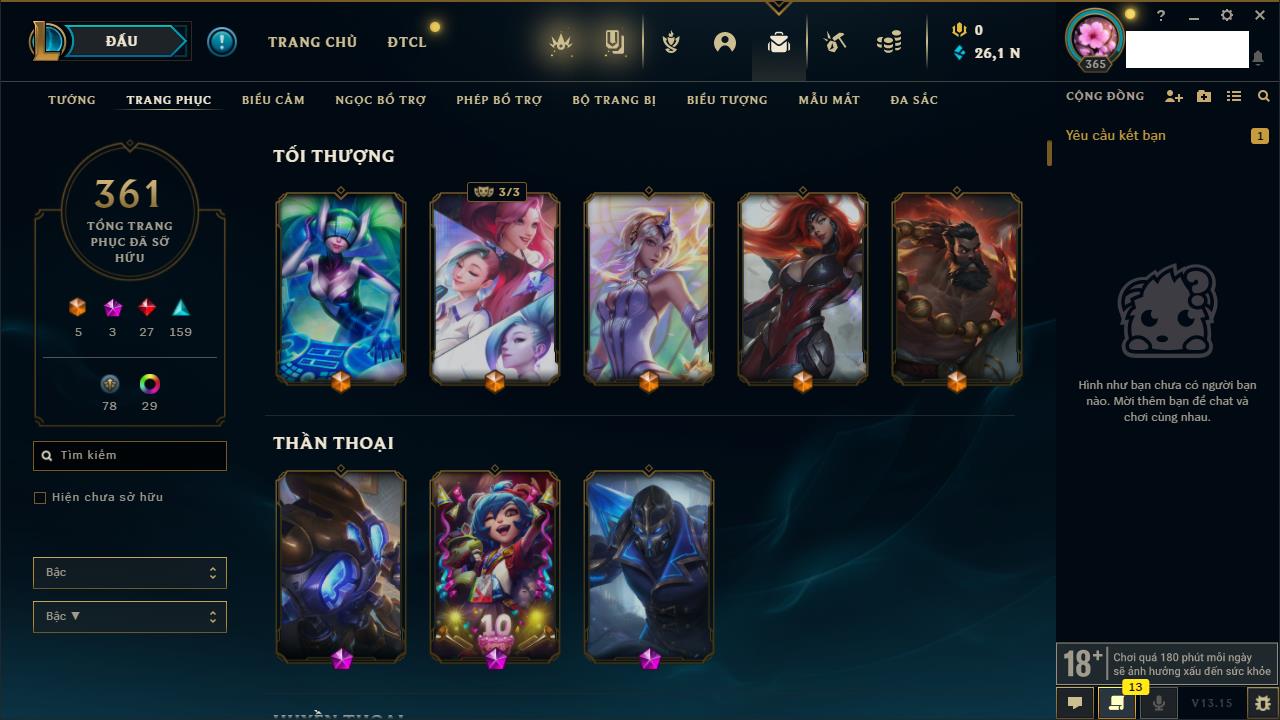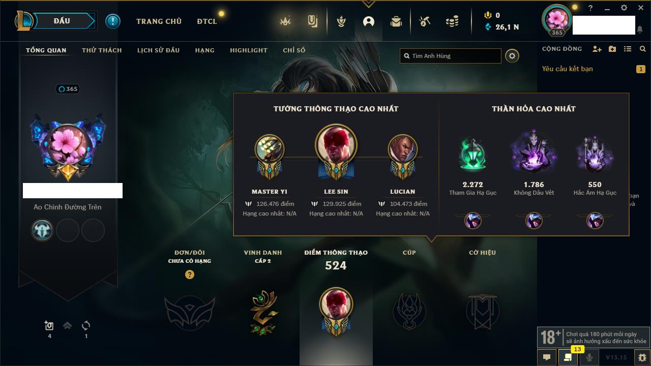 Rank Đơn: Chưa RankKhung: Chưa có khungTướng: 167 - Còn 100681 THXTrang Phục: 404Rank ĐTCL: Chưa RankLinh Thú: 207