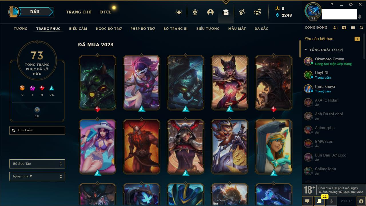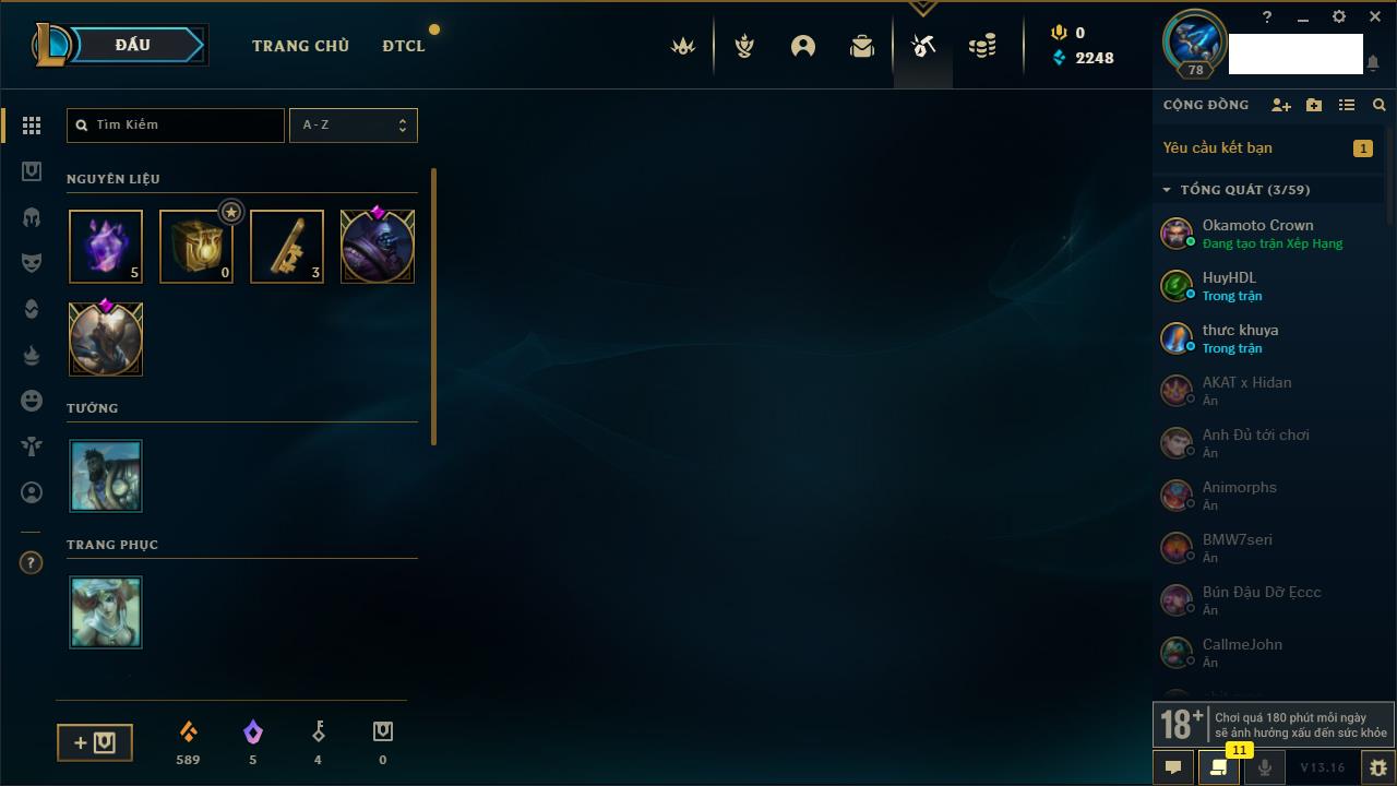 Rank Đơn: Chưa RankKhung: Chưa có khungTướng: 161 - Còn 2248 THXTrang Phục: 73Rank ĐTCL: Chưa RankLinh Thú: 63