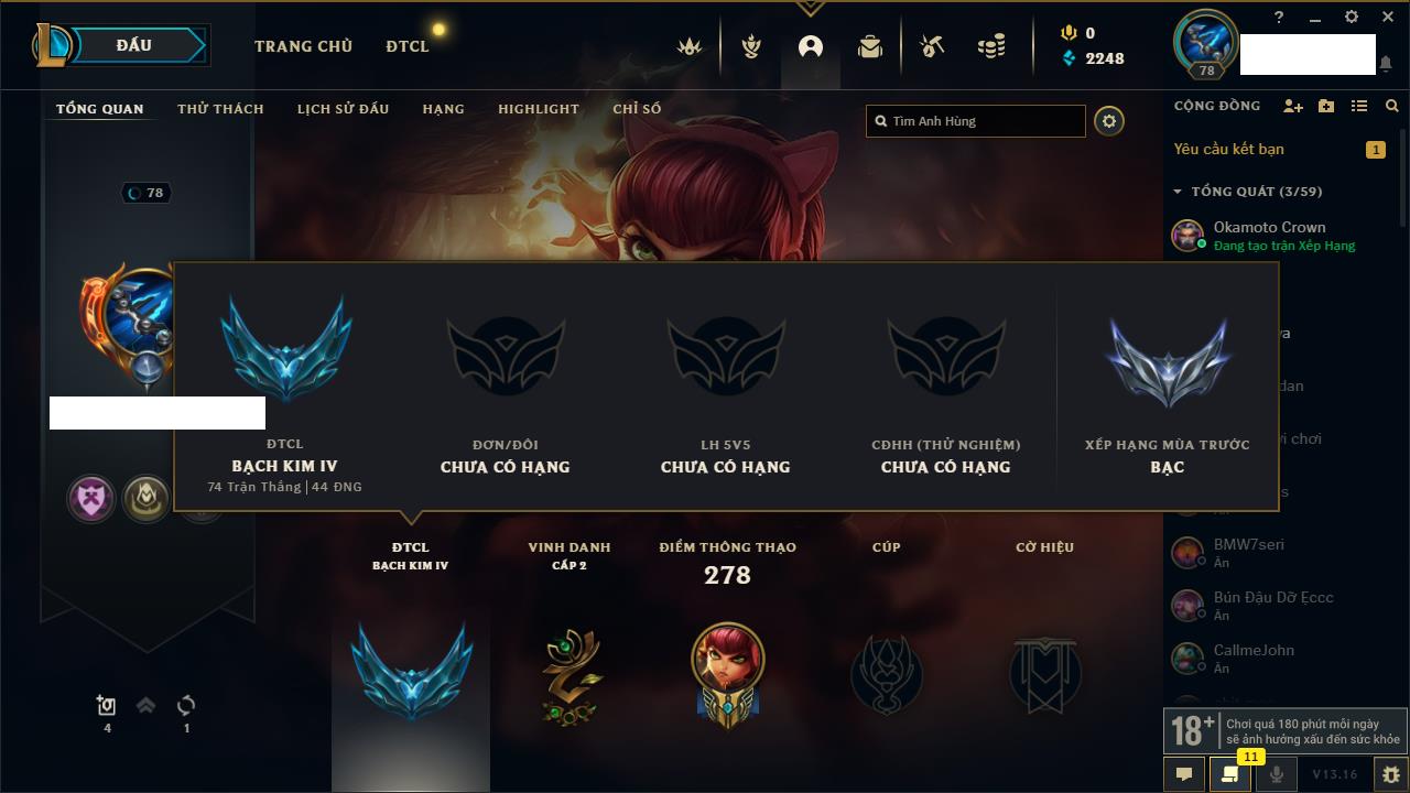 Rank Đơn: Chưa RankKhung: Chưa có khungTướng: 144 - Còn 7530 THXTrang Phục: 75Rank ĐTCL: Chưa RankLinh Thú: 9