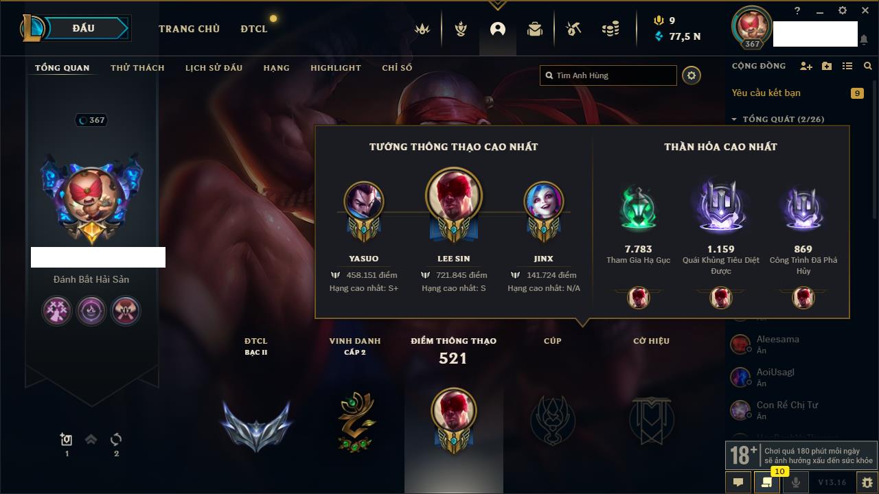 Rank Đơn: Đồng IIKhung: ĐồngTướng: 170 - Còn 66145 THXTrang Phục: 215Rank ĐTCL: Chưa RankLinh Thú: 52