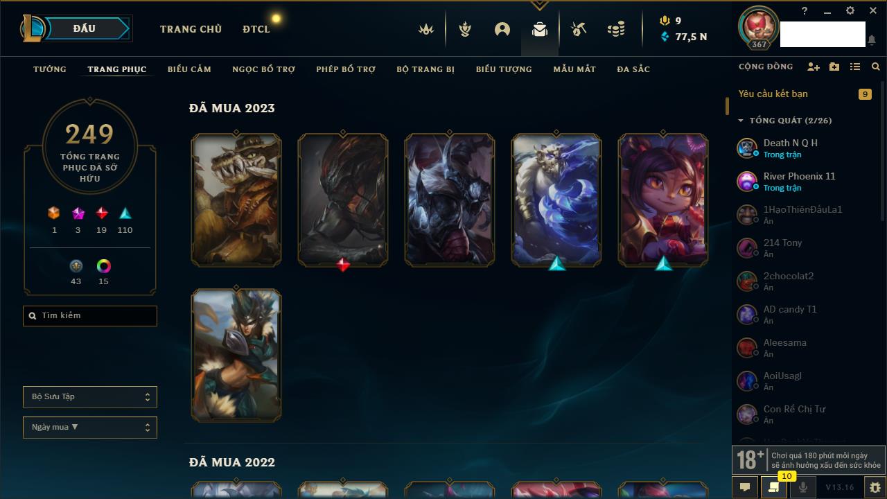 Rank Đơn: Vàng IIIKhung: BạcTướng: 171 - Còn 101359 THXTrang Phục: 88Rank ĐTCL: Kim Cương IVLinh Thú: 200