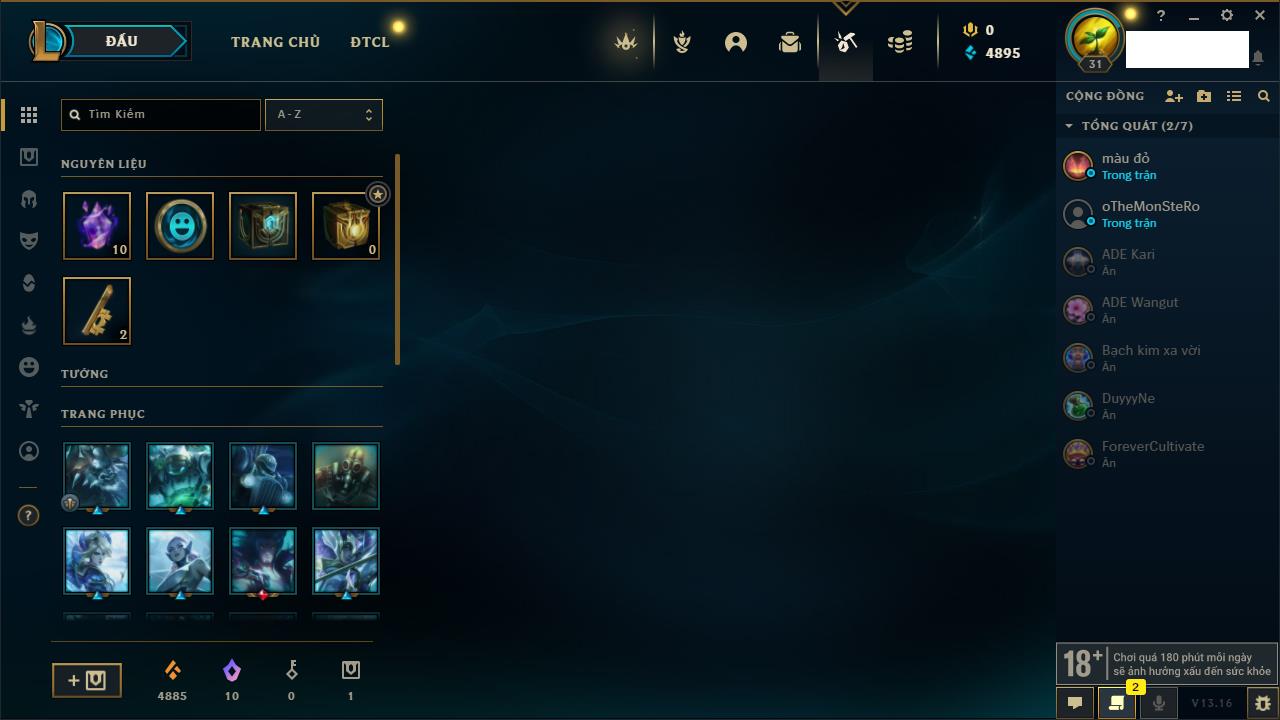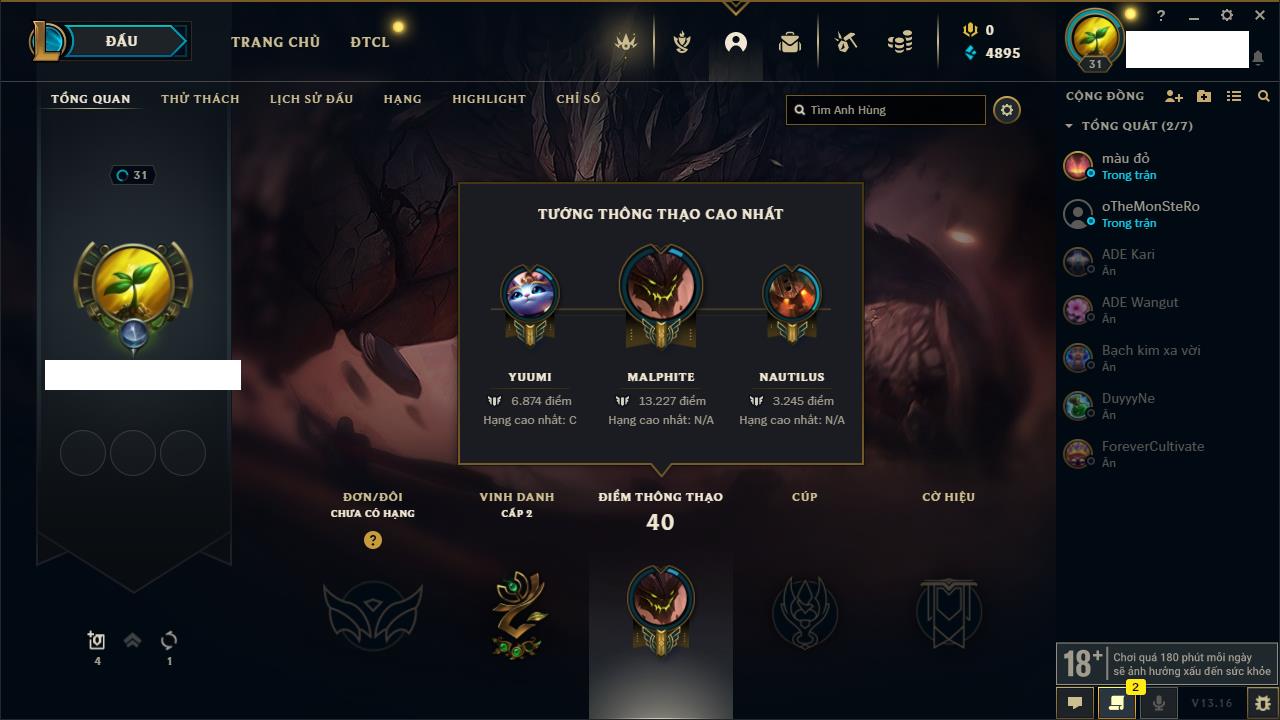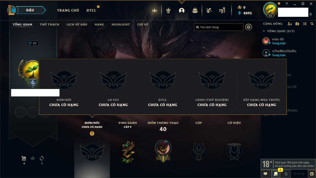 Rank Đơn: Chưa rank mùa nàoKhung: Chưa có khungTướng: 2 - Còn 9000 THXTrang Phục: 0Rank ĐTCL: Bạch Kim IIILinh Thú: 31