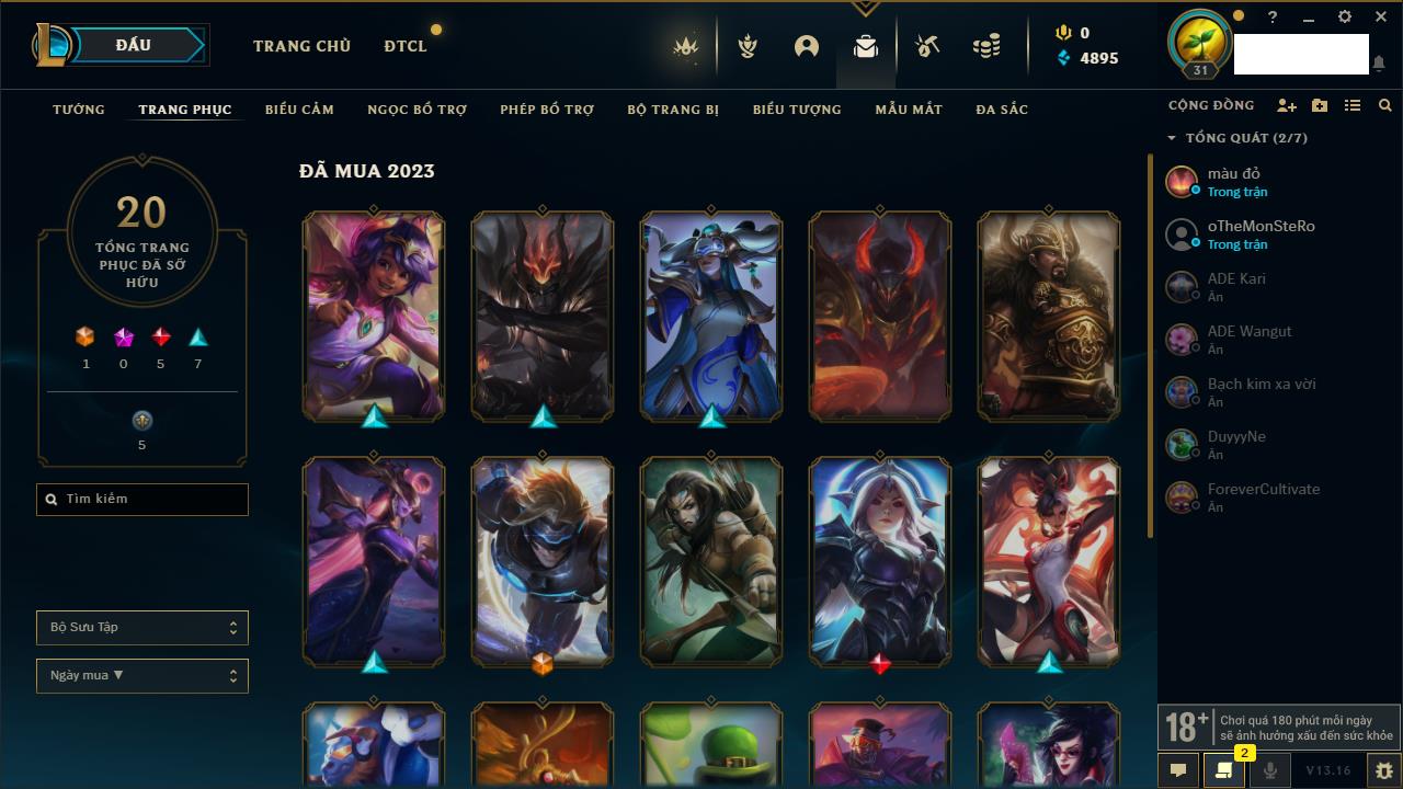 Rank Đơn: Chưa rank mùa nàoKhung: Chưa có khungTướng: 20 - Còn 6065 THXTrang Phục: 12Rank ĐTCL: Chưa RankLinh Thú: 59