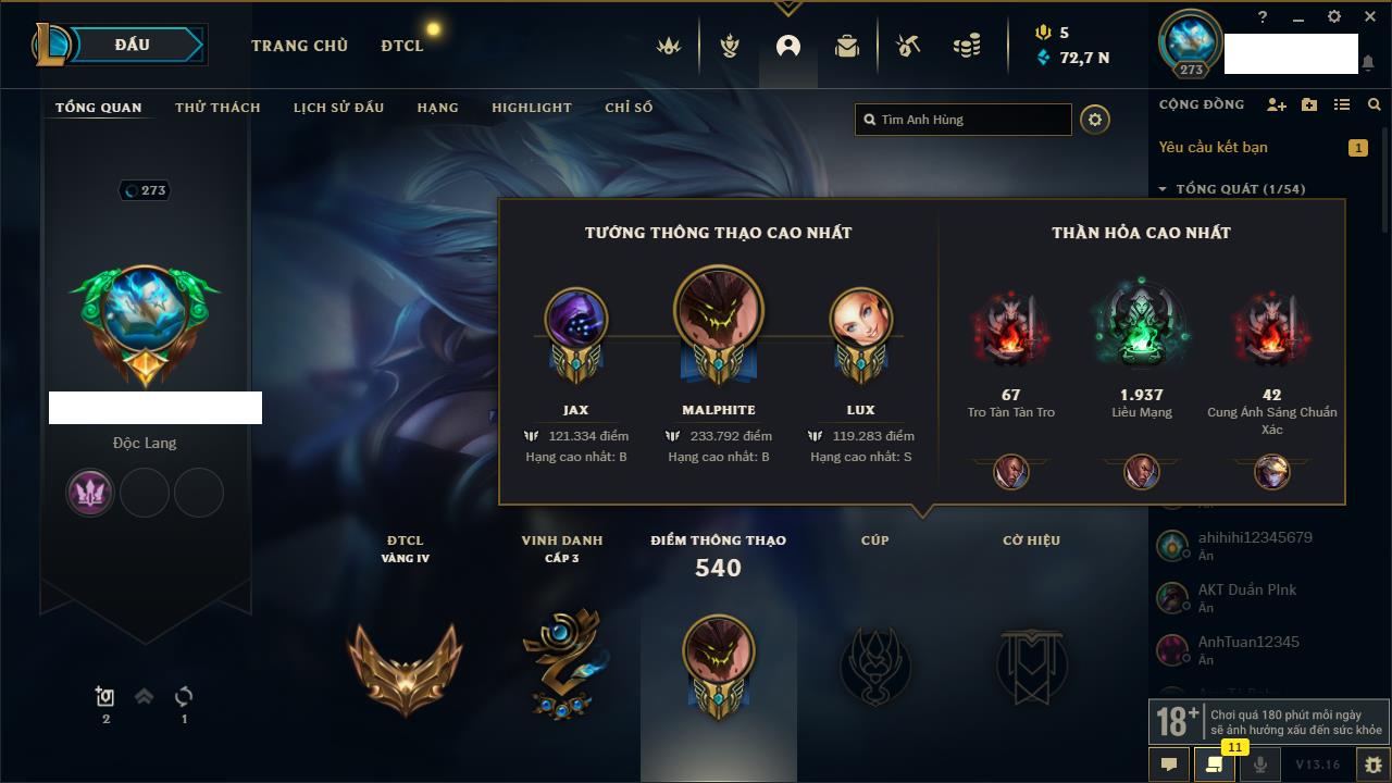 Rank Đơn: Chưa RankKhung: BạcTướng: 141 - Còn 299 THXTrang Phục: 101Rank ĐTCL: Chưa RankLinh Thú: 84