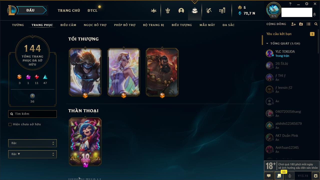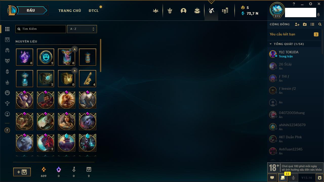 Rank Đơn: Chưa RankKhung: Chưa có khungTướng: 163 - Còn 157403 THXTrang Phục: 149Rank ĐTCL: Chưa RankLinh Thú: 122