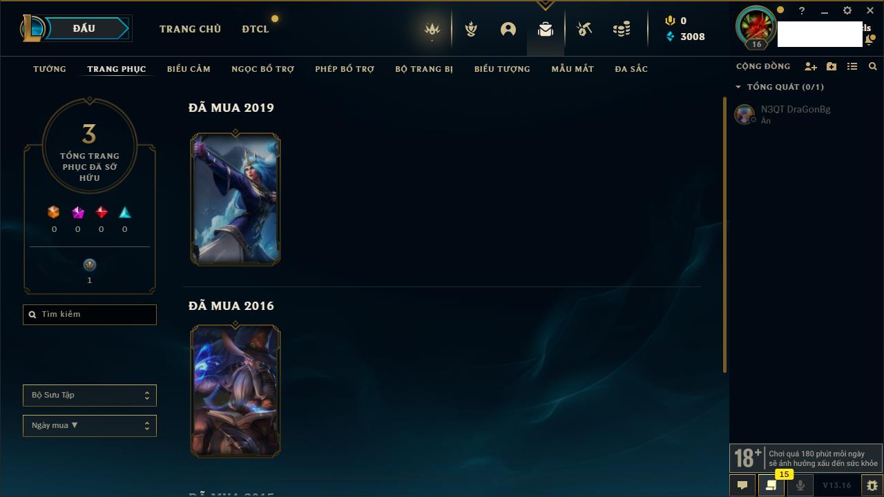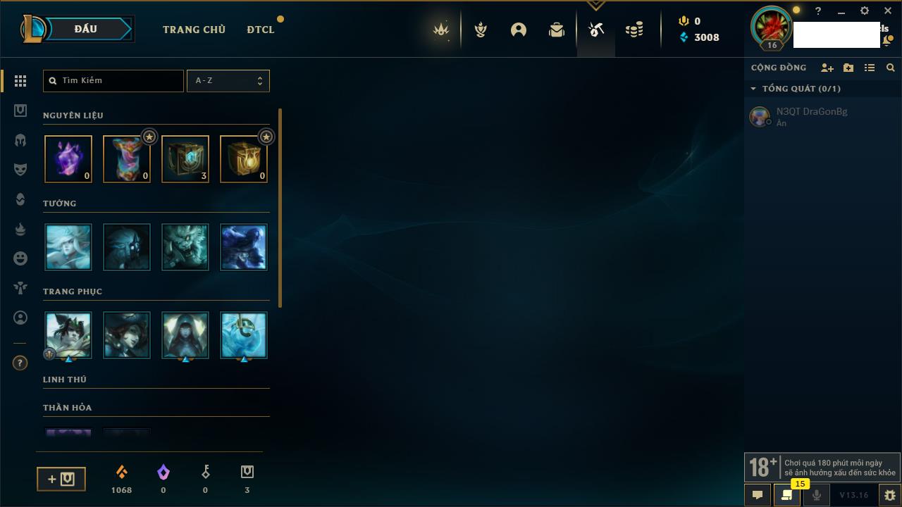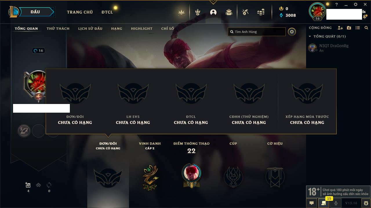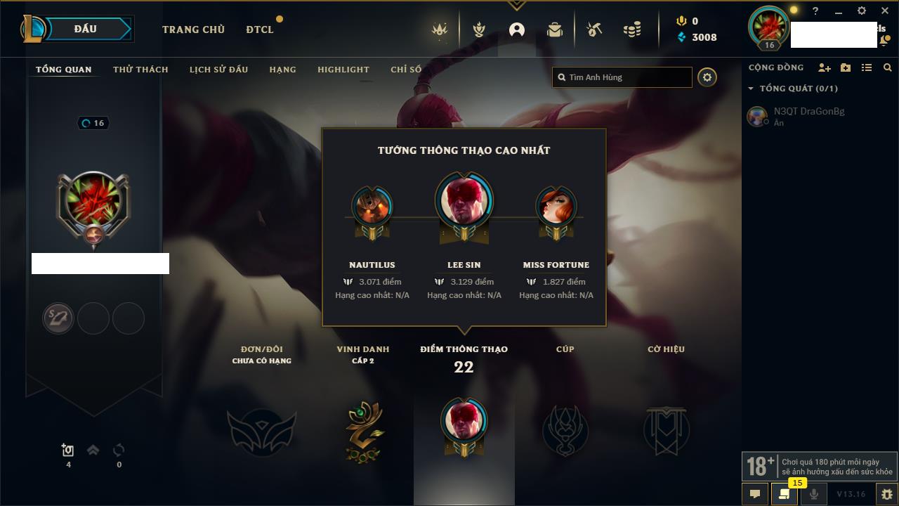 Rank Đơn: Chưa rank mùa nàoKhung: Chưa có khungTướng: 0 - Còn 6800 THXTrang Phục: 0Rank ĐTCL: Chưa RankLinh Thú: 24